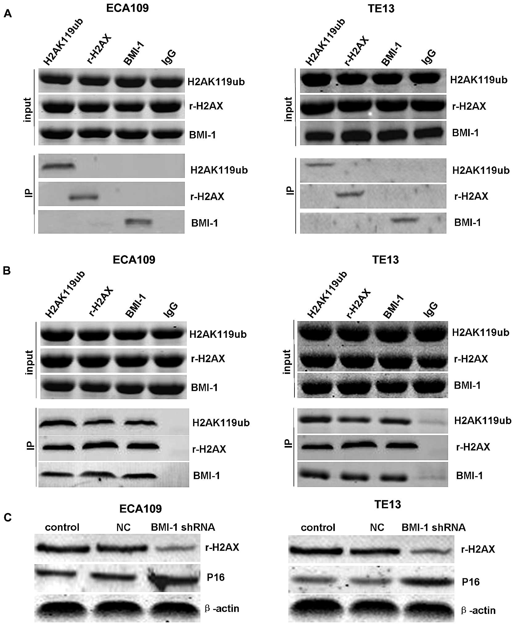 The specificity of this interaction was confirmed by Co-IP of H2AK119ub, r-H2AX and BMI-1. Notably, the interactions between BMI-1 and H2AK119ub or r-H2AX were obviously enhanced in the ECA109 and TE13 cells after IR (Fig. 4B), while there was no significant interaction without irradiation (Fig. 4A). This modification was induced by DNA damage as we observed that the ubiquitination and phosphorylation of H2AX were increased upon IR, indicating that BMI-1 may play an important role in DNA damage repair through inducing the ubiquitination and phosphorylation of H2AX. In addition, the downregulation of r-H2AX and upregulation of P16 were detected in the BMI-1 shRNA group after knockdown of BMI-1 expression (Fig. 4C).