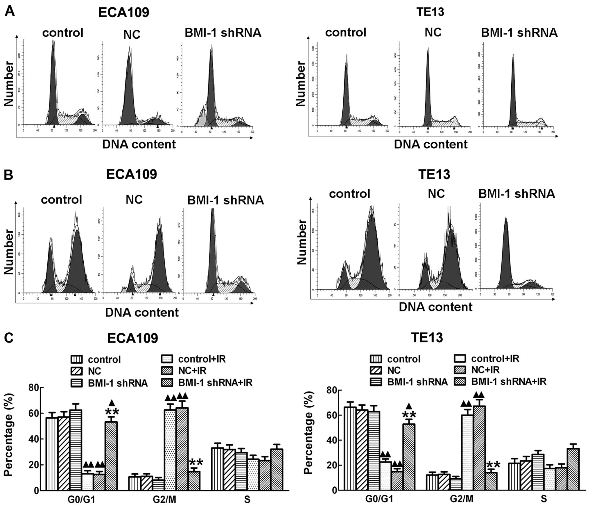 In order to further explore the mechanisms involved in the promotion of radiosensitization of esophageal cancer cells by silencing of BMI-1, flow cytometry was performed and demonstrated that irradiation obviously induced cell cycle arrest at the G2/M stage after irradiation for 24 h both in the ECA109 and TE13 cells in vitro. However, silencing of BMI-1 by shRNA obviously decreased the cell cycle arrest after irradiation (Fig. 5B), which allowed much time for repair of damaged tumor cells. Cancer cell repair may decrease the killing effect of RT, which induces radioresistance. With no irradiation, there was no significant difference among the BMI-1 shRNA, control and NC groups (Fig. 5A). Our results showed that knockdown of BMI-1 expression in esophageal cancer ECA109 and TE13 cells by RNA interference technology after exposure to irradiation decreased the G2/M phase arrest in cells to a certain degree, reducing the opportunity of tumor cells to repair thereby enhancing radiosensitivity.