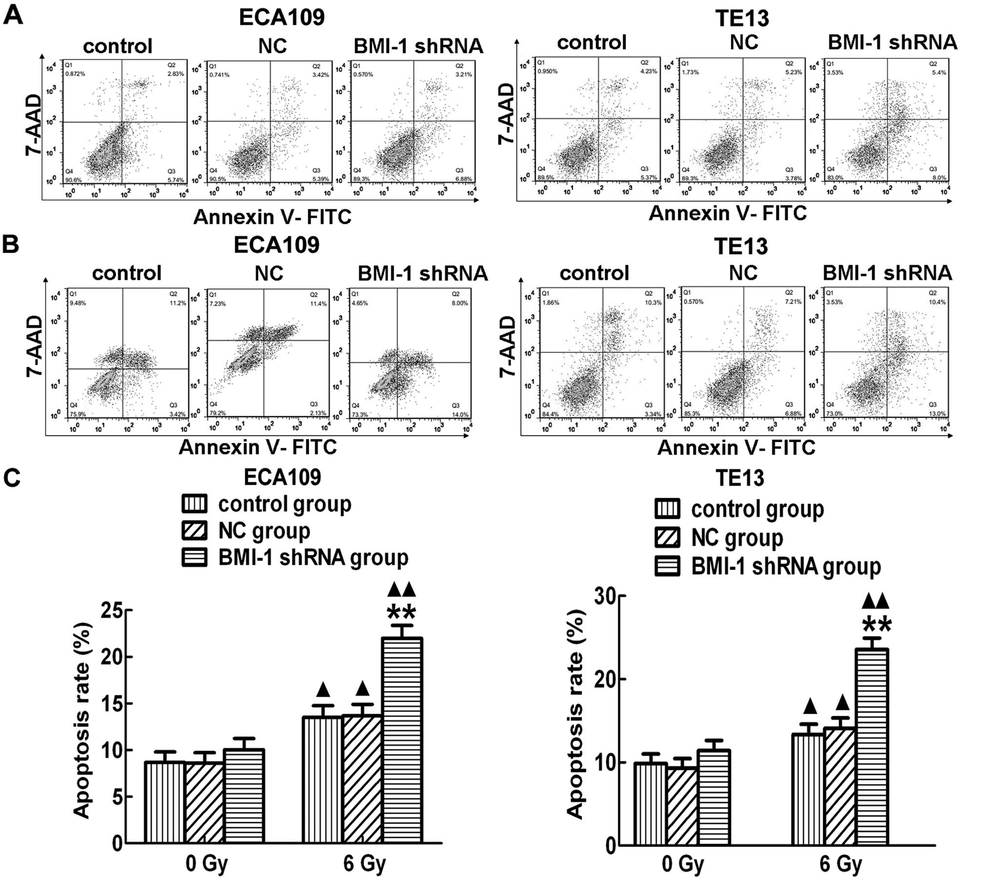 Cellular responses to DNA damage include cell cycle arrest and apoptosis. The highest expression of BMI-1 is observed in the G2/M phase (21,22). Our data revealed that inhibition of the expression of BMI-1 by shRNA in ECA109 and TE13 cells significantly induced spontaneous cell apoptosis and eliminated cell cycle arrest at the G2/M phase of the cell cycle after RT. However, given no ionizing radiation, there was no statistically significant difference among the control, NC and BMI-1 shRNA group. These results are in accordance with previous studies on esophageal carcinoma (23) and cervical carcinoma cells (24). Accordingly, this method of suppressing BMI-1 expression which leads to cell growth inhibition and the induction of apoptosis, in turn reduces the proliferation of esophageal carcinoma cells, indicating that it may have a significant therapeutic effect on esophageal carcinoma (25,26). In the present study, our data showed that the apoptosis rate of cells was higher in the BMI-1 shRNA group than that noted in the control and NC group after exposure to irradiation, while there was no statistically significant difference among the 3 groups without RT. Meanwhile, our results further indicated that the promotive effect of BMI-1 shRNA on the apoptosis in ECA109 and TE13 cells after treatment with irradiation was accompanied by upregulated expression of bcl-2 and downregulation of bax, which are associated with cell apoptosis after DNA damage. These results are in accordance with previous studies, which showed that BMI-1 increased cell apoptosis through regulation of apoptosis-related proteins (27–29), and further enhanced radiosensitivity.