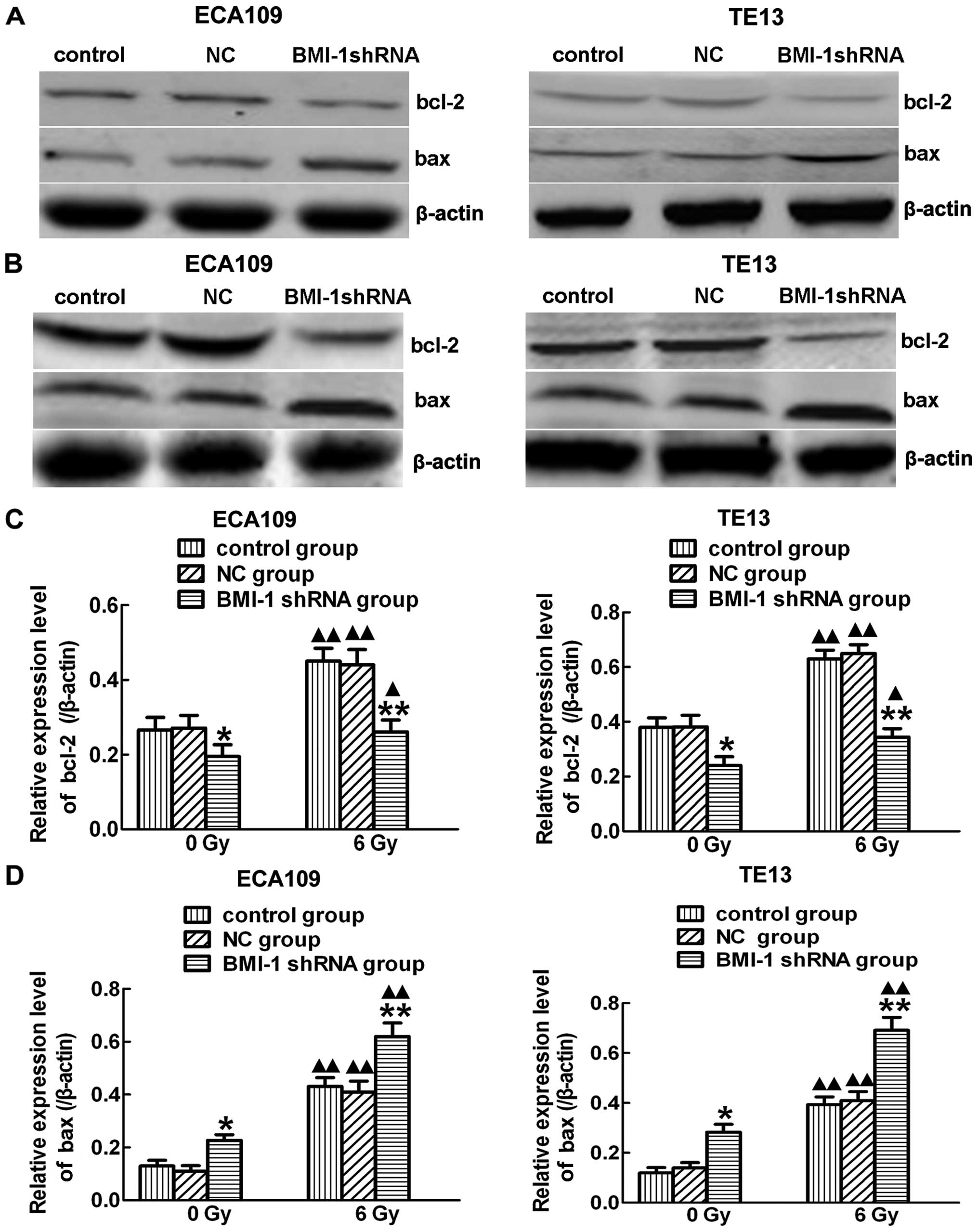 In addition, the apoptosis rate was not obviously different among the control, NC and BMI-1 shRNA groups, in vitro without irradiation (Fig. 6A). However, the apoptosis rate in the BMI-1 shRNA group was significantly higher than that of the other two groups after RT both in the ECA109 and TE13 cells (Fig. 6B and C). In addition, the apoptosis levels in the different groups were increased after irradiation. In order to further explore the mechanism, we observed the expression levels of bcl-2 and bax after (Fig. 7B) and before irradiation (Fig. 7A). Significant downregulation of bcl-2 (Fig. 7C) and upregulation of bax (Fig. 7D) were observed in the BMI-1-shRNA group after treatment with irradiation. Notably, there were no significant changes among the 3 groups without irradiation. Thus, BMI-1 has the ability to regulate the cell cycle, induce apoptosis and thus promote radiosensitivity after IR.