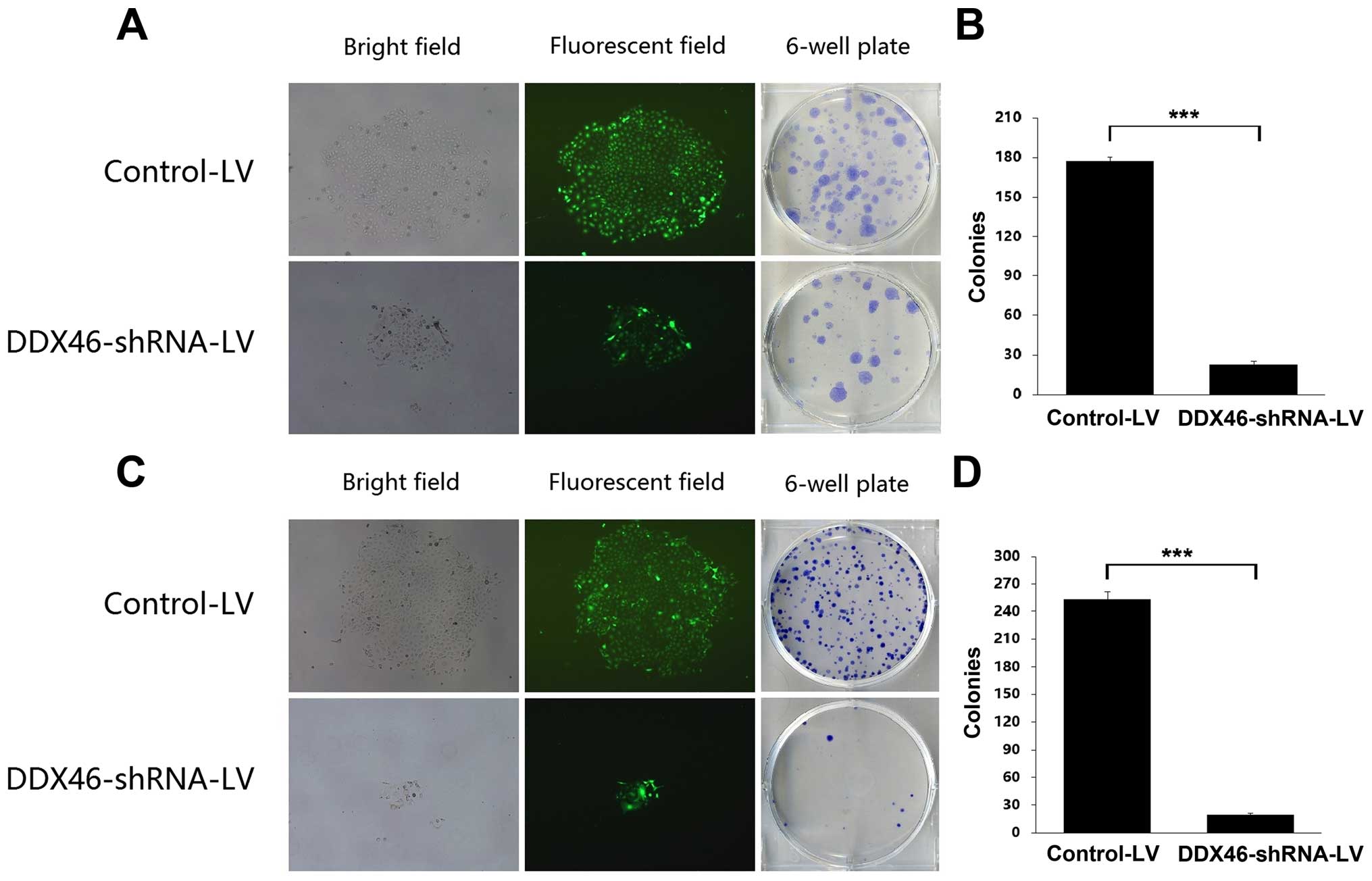 In order to determine the effects of DDX46 on cell growth, cells with green fluorescence were counted once a day for 5 consecutive days using HCS (Fig. 4A and D). The number of GFP-labeled cells in the DDX46-shRNA-LV group was greatly decreased compared to the Control-LV group in both TE-1 (Fig. 4B) and Eca-109 (Fig. 4E) cells. Silencing DDX46 also significantly inhibited cell viability that was analyzed by MTT assays. As illustrated in Fig. 4C and F, cell viability of DDX46-shRNA-LV transfected TE-1 and Eca-109 cells were significantly reduced in a time-dependent manner. Additionally, DDX46 knockdown significantly suppressed colony formation capacity in ESCC cells. The number and size of colonies in both DDX46-shRNA-LV transfected TE-1 and Eca-109 cells were significantly reduced compared with the corresponding Control-LV group (Fig. 5). Collectively, these results suggested that overexpression of DDX46 played an essential role in proliferation of ESCC cells in vitro.