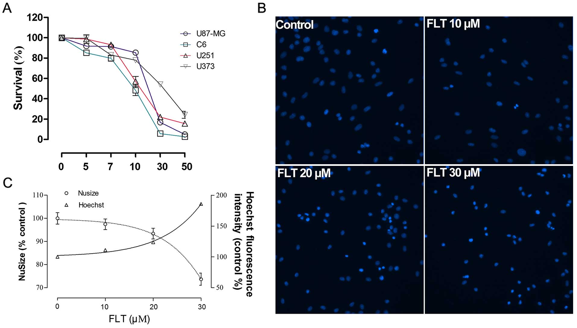 FLT is well recognized for its anti-proliferative activity. To determine the effect of FLT on the growth of glioma cells, various glioma cell lines including C6,U87-MG, U373 and U251 glioma cells were used to exam the growth inhibitory ability of FLT by using a CCK-8 assay. All the four glioma cells showed significant inhibition of cell proliferation upon FLT treatment in a dose-dependent manner (Fig. 1A). The IC50 levels of FLT for C6, U87-MG, U373 and U251 cells were 14.7, 21.8, 48.5 and 22.9 μM, respectively. In particular, C6 cells had a highly sensitive response to the addition of FLT. Thus, C6 cells were selected for further study.