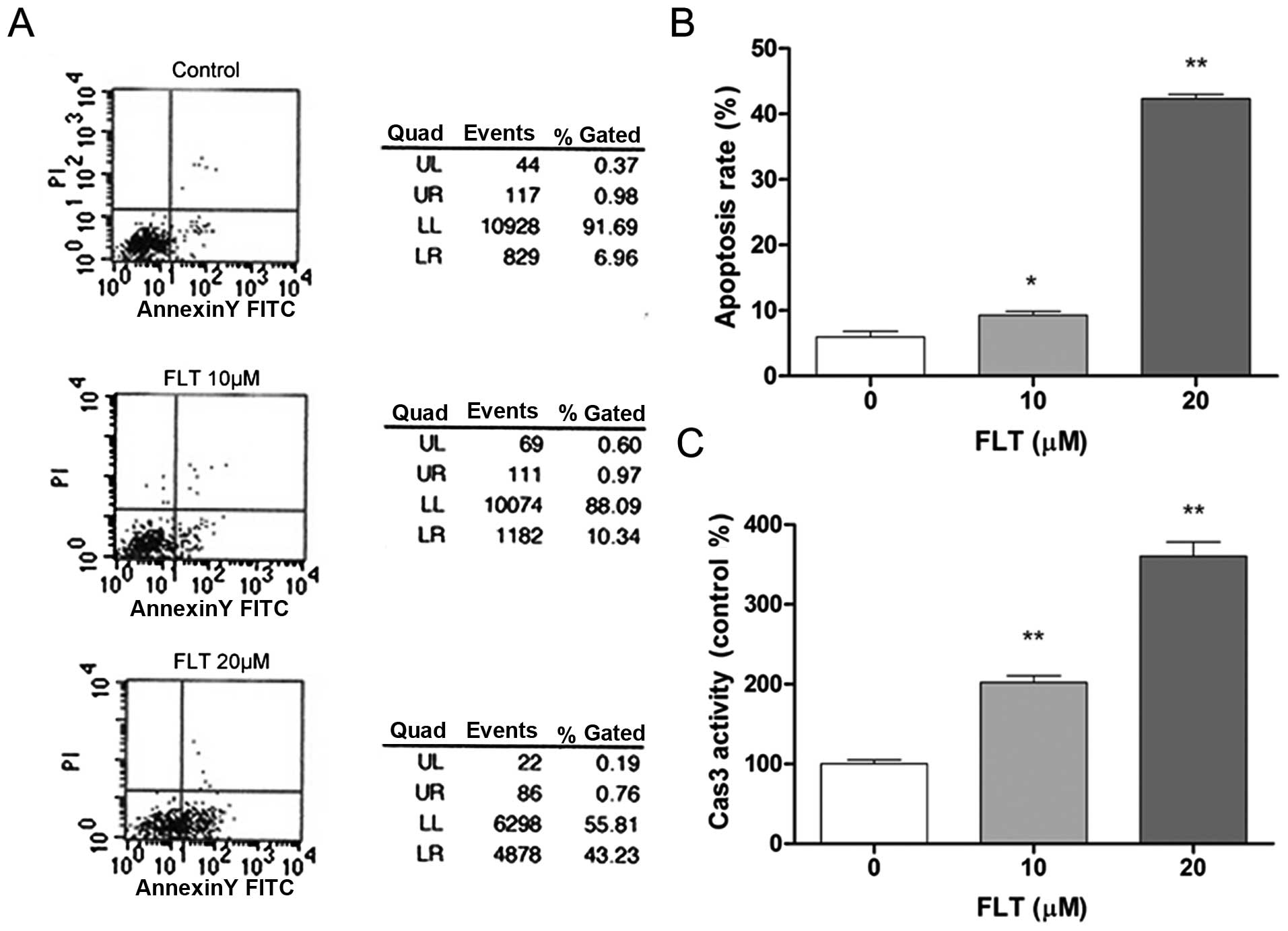 To determine whether FLT influences C6 cell apoptosis, we examined the effects of FLT on cell apoptosis. The results showed that FLT treatment for 24 h decreased the nuclear size of the C6 cells and increased the Hoechst fluorescence intensity in the nuclei in a dose-dependent manner. The nuclei of the C6 cells were significantly condensed at the FLT concentration of 10 μM with the concomitant enhanced intensity of Hoechst fluorescence in the nuclei, showing the typical phenotype of apoptosis. This effect was more pronounced with the increase in the drug concentration to above 20 μM (Fig. 1B and C). To further determine whether FLT influences cell apoptosis, flow cytometry was performed. As shown in Fig. 2A and B, the early apoptosis rate of the C6 cells following FLT (0, 10, 20 μM) treatment by flow cytometry was 6.5, 9.21 and 45.3%, respectively, which demonstrated that FLT significantly increased the percentage of apoptotic cells (Fig. 2A and B). We further assessed the activation of a key apoptosis mediator caspase-3. After FLT treatment, the enzyme activities of caspase-3 in the C6 cells were evidently enhanced (Fig. 2C). These results indicated that FLT can effectively promote the apoptosis of C6 cells.