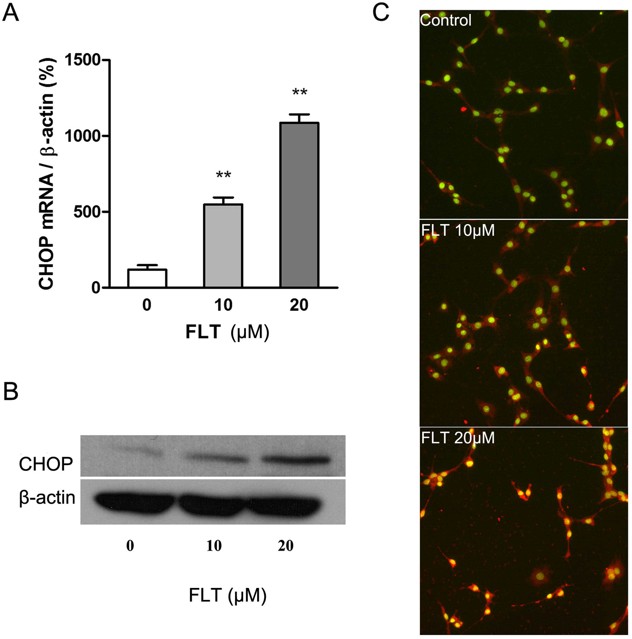 Next, we focused on the endoplasmic reticulum stress (ERS) apoptotic pathway. Firstly we examined the effects of FLT on CHOP, a hallmark of ERS, by real-time RT-PCR, western blotting and HCS, respectively. The results showed that 10 μM FLT treatment for 24 h significantly increased the transcription activation of CHOP mRNA (P<0.05), and the effect was more pronounced under the higher drug concentration (20 μM) (P<0.01) (Fig. 4A). CHOP protein is present in the cytosol under non-stressed conditions. It can be robustly induced under cell stress conditions and thereafter translocates into nuclei (Fig. 4C). The result of western blotting showed that treatment of FLT (20 μM, 24 h) significantly increased the expression of CHOP protein (Fig. 4B).