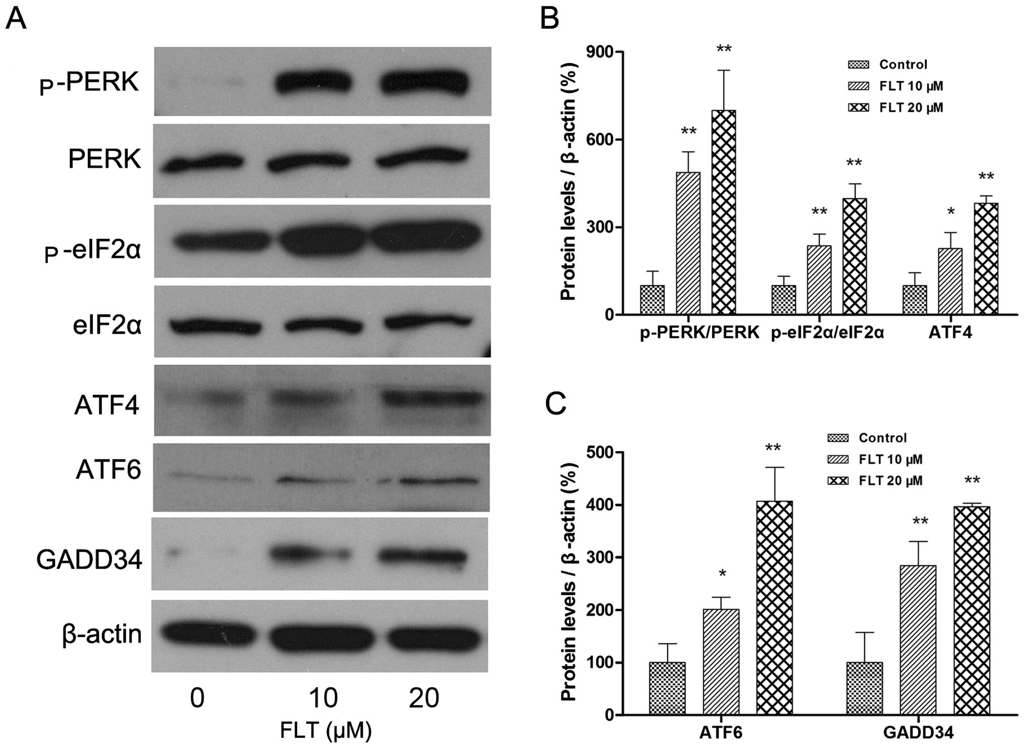 Then, we investigated the upstream and downstream signaling pathway of CHOP. The 3 principal unfolded protein response (UPR) receptors involved are PERK, ATF6 and Ire1, all of which induce expression of CHOP. The protein levels of PERK-eIF2α-ATF4 and ATF6 were examined by western blotting. The results showed that FLT treatment (10 and 20 μM) markedly increased the autophosphorylation of PERK and eIF2α. In addition, ATF4, the downstream target of eIF2α was increased as well. Meanwhile, another ER stress sensor ATF6 was also markedly upregulated following FLT treatment (Fig. 5). Concomitantly, the protein expression of GADD34, one of the transcriptional downstream effector genes of CHOP activation, was also upregulated (Fig. 5).