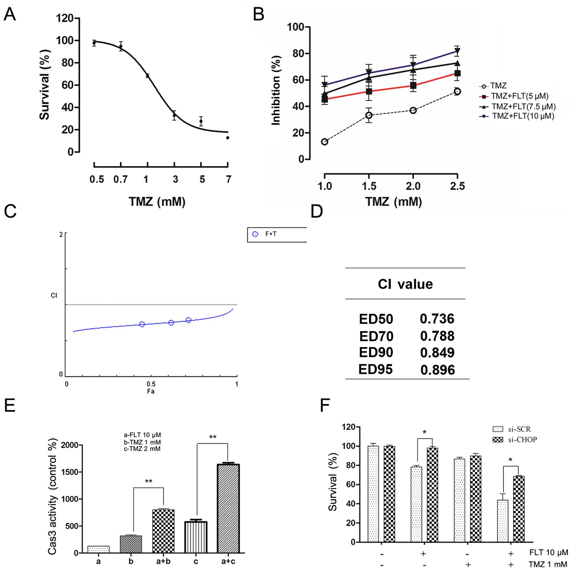 To explore the possibility of synergistic cytotoxicity, C6 cells were treated with various concentrations of FLT and TMZ, either alone or in combination. Cell viability was determined by CCK-8 assay and synergistic effects between the two drugs were evaluated using the CompuSyn 2.0 software (ComboSyn, Inc., Paramus, NJ, USA) (23). First, the effect of TMZ alone on the viability of the C6 cells was examined. As shown in Fig. 6A, TMZ dose-dependently reduced cell viability after a 24-h treatment. In the TMZ treatment group, the 24-h IC50 was 2.23 mM. Then, the C6 cells were treated in culture with a combination of FLT and TMZ at various concentrations for 24 h. The combination of FLT and TMZ at certain drug concentrations led to marked effects in decreasing the viability of the C6 cells (Fig. 6B). Synergistic analysis is presented with a Fa-CI plot and CI values (Fig. 6C and D). It was observed that the combination of FLT and TMZ produced a significant synergistic effect and had a CI value below 1.0 (range, 0.736–0.896). The synergism was particularly obvious at lower inhibitory concentrations, whereas little impact was observed at higher proliferation suppression. The synergistic effects of FLT and TMZ were also determined in caspase-3 activity analysis following treatment with TMZ and FLT in the C6 cells (Fig. 6E). Knockdown of CHOP expression by CHOP-specific siRNA was used to further confirm the role of CHOP in the synergistic effect of FLT. CHOP-specific siRNA effectively downregulated CHOP mRNA and protein levels (24). We did not observe enhanced cytotoxicity following treatment with TMZ plus FLT compared to TMZ alone in the C6 cells with CHOP depletion (Fig. 6F). These results suggested that FLT may sensitize glioma cells to TMZ by activating CHOP.