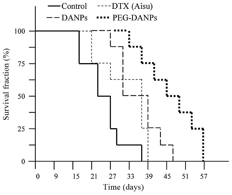 The PEG chain of PEG-DANPs is hydrophilic, it is currently thought to act as a protector to achieve long circulation time of drugs in the blood. It accumulated in the liver, spleen and lung, and finally was released from these organs to blood circulation according to the drug concentration gradient (29), which resulted in a sustained blood level compared to Aisu® and DANPs. From the above results, we can make a conclusion that PEG-DANPs can not only increase the concentration and uptake of antitumor drugs in the tumors, but also prolong the time that drugs are sustained in the blood (33,34), which are the main approaches to increase antitumor activity and inhibit tumor growth in chemotherapy.
