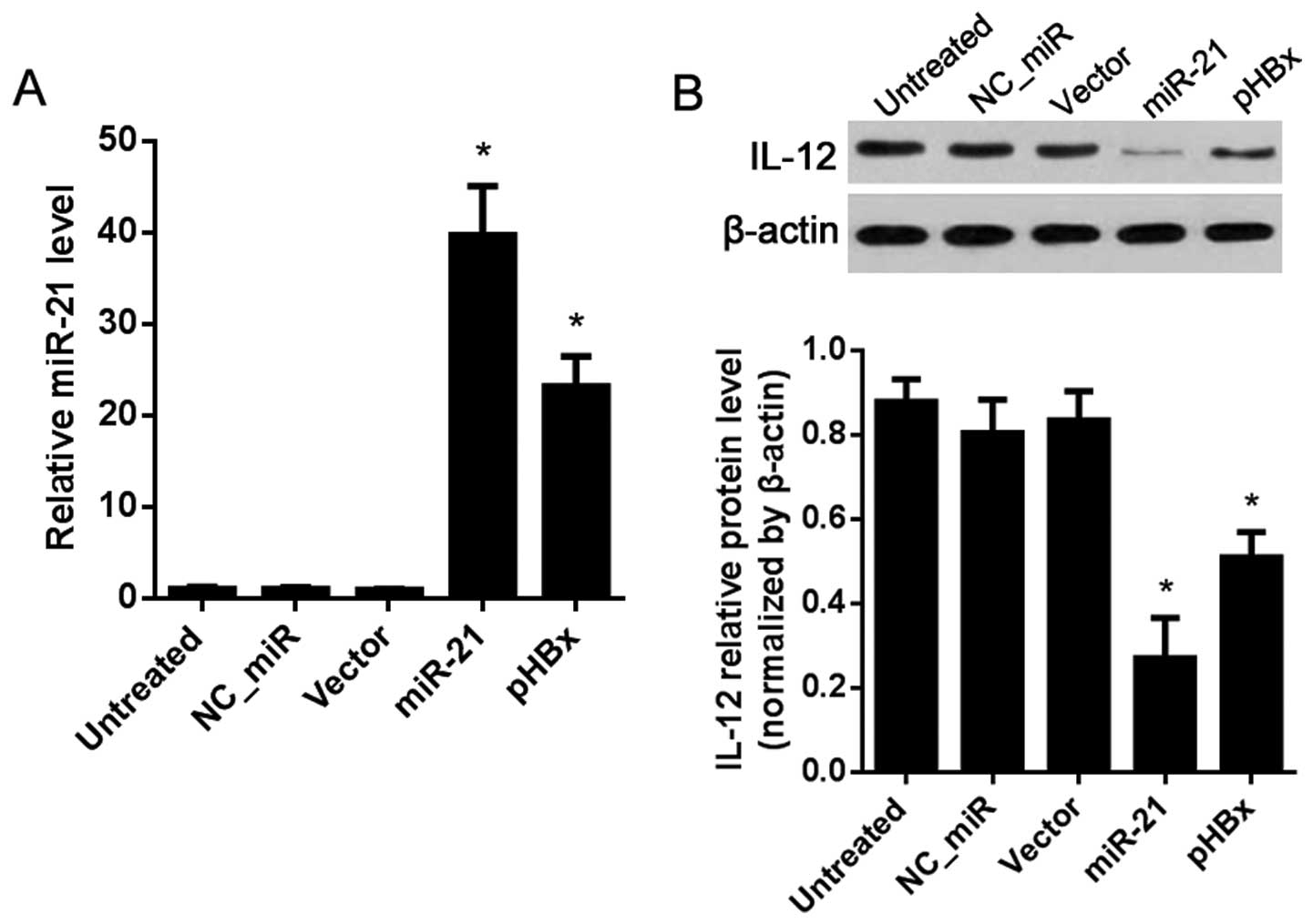 Our study confirmed that IL-12 is a direct target of miR-21 and miR-21 can be upregulated by HBx protein in hepatic cells. A high level of HBx also resulted in the inhibition of IL-12. A high level of miR-21 resulted in a significant decrease in IL-12 expression and an increase in proliferation. Inhibition of miR-21 resulted in a significant increase in IL-12 expression and an increase in apoptosis. The results suggest that the suppression of apoptosis in HCC cells was at least partially carried out through HBx-induced miR-21 by targeting IL-12.