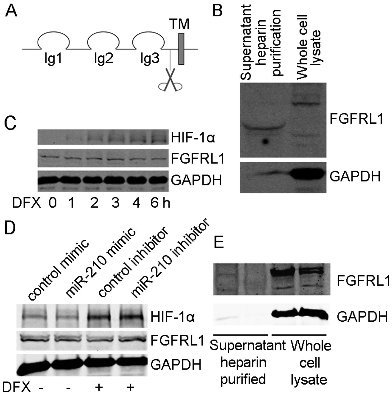 Next, we determined whether hypoxia treatment changed the expression of FGFRL1. SMMC-7721 cells were treated with DFX for different time periods. HIF1α expression was induced while the expression of FGFRL1 declined (Fig. 3C). To assess whether the decrease of FGFRL1 following hypoxia was miR-210-dependent, we transiently transfected SMMC-7721 cells with miR-210 mimic, miR-210 inhibitor and their respective controls. The results showed that compared with mimic-control transfected cells, miR-210 mimic transfected cells had lower expression of FGFRL1, which is similar to the decrease seen in DFX-treated cells (Fig. 3D). miR-210 inhibitor transfected cells showed no decrease of FGFRL1 when treated with DFX (Fig. 3D). These results indicated that hypoxia-induced downregulation of FGFRL1 was mainly through miR-210. We further assessed whether expression of miR-210 downregulated FGFRL1 secretion. The heparin extract of the supernatant and whole cell lysate of miR-210 stably transfected and control cells were examined by WB. The results showed that miR-210 expression downregulated FGFRL1 both inside and outside the cells (Fig. 3E). Hence, we conclude that hypoxia-induced miR-210 targets FGFRL1 expression and secretion in HCC.