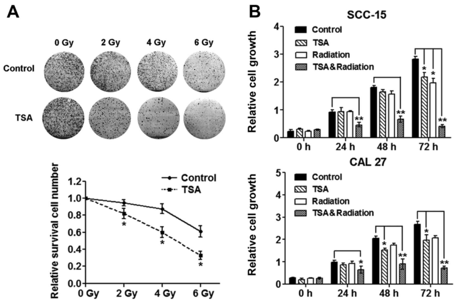 To determine the dose of irradiation and TSA that could be used without significantly affecting cell vitality, TSCC cells were treated with different concentrations of TSA or different dose of irradiation. Neither TSA (1 µg/ml) nor irradiation (4 Gy) significantly affected the vitality of TSCC cells (Fig. 1A), so we used these non-cytotoxic doses in the subsequent experiments. We then used CCK-8 assays to determine whether TSA can regulate radiosensitivity in TSCC cells. Treatment with TSA or irradiation alone only slightly reduced the cell proliferation until 72 h after treatment. However, combination treatment with TSA and irradiation significantly reduced the proliferation of SCC-15 and CAL27 cells from 24 to 72 h after treatment (Fig. 1B). The colony formation ability of CAL27 cells was also examined. The results showed that after a mild dose of irradiation treatment (≤6 Gy), the colony formation of CAL27 cells was gradually attenuated (Fig. 1A), and pretreatment with TSA (1 µg/ml) further enhanced the activity of irradiation (Fig. 1A).