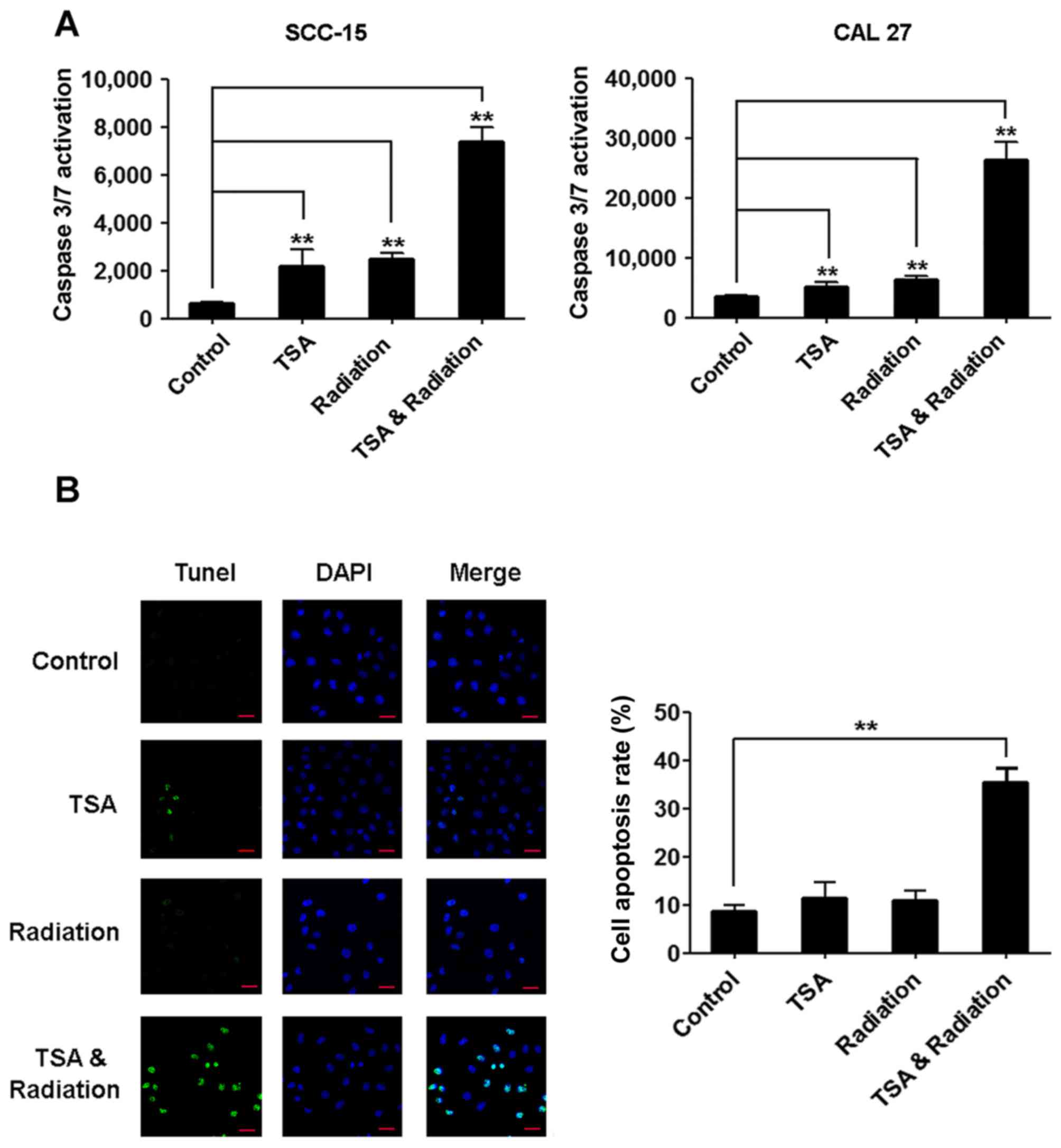 To further confirm that TSA increases the radiosensitivity of TSCC cells, we measured caspase-3/7 and apoptosis after the treatments. The activity of caspase-3/7 was upregulated after treatment with TSA or irradiation alone, and further upregulated after the combinational treatment with TSA and irradiation (Fig. 2A). Consistently, the number of apoptotic cells revealed by TUNEL staining was slightly increased by treatment with TSA or irradiation alone, and was significantly increased by the combinational treatment with TSA and irradiation (Fig. 2B).