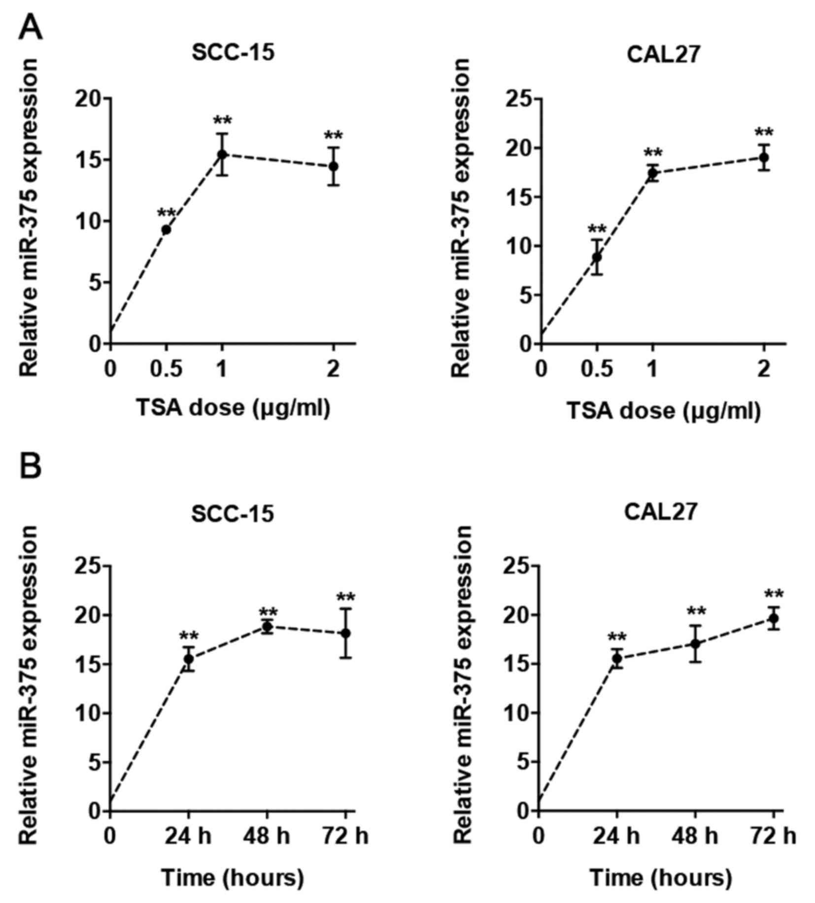 In this study, we aimed to confirm the effects of TSA on the radiosensitivity of TSCC cells, and to determine whether the miR-375 mediates the pharmacological regulation of radioresistance by TSA.