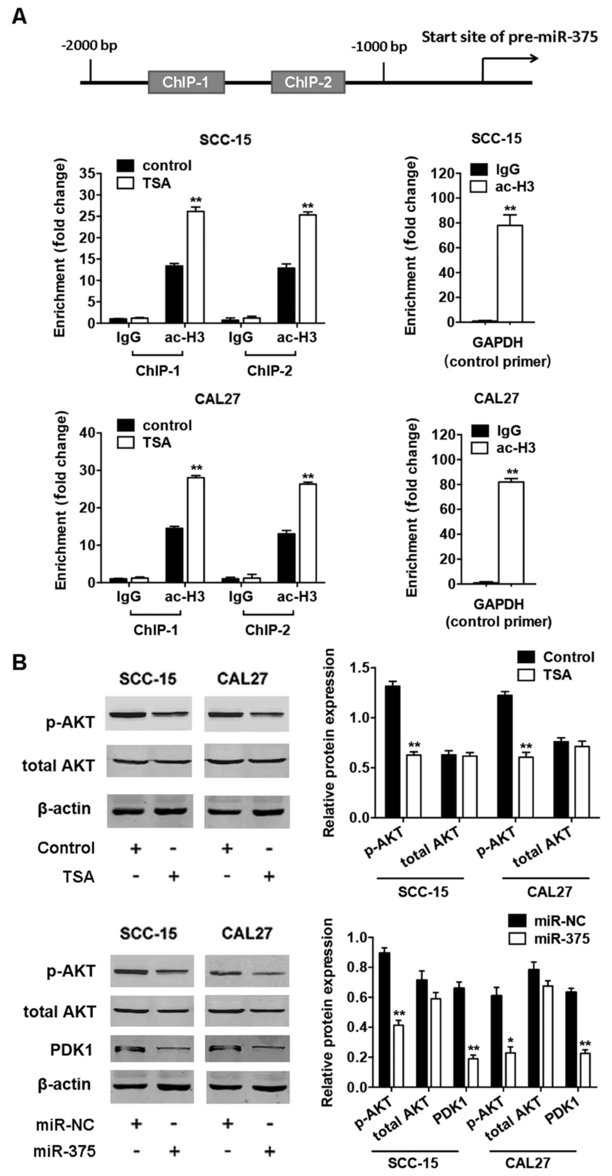 To determine whether miR-375 is involved in the regulation of radiosensitivity by TSA, we first treated the TSCC cells with TSA in different concentrations (0.5–2 µg/ml) and time (24–72 h), and found that TSA upregulated miR-375 expression dose-dependently (Fig. 3A) and time-dependently (Fig. 3B). Then, we checked the histone acetylation in the miR-375 promoter region by ChIP assays after TSA treatment. Two pairs of primers were designed to analyze the status of ac-H3 in the promoter. We found that TSA significantly increased the levels of ac-H3 in the fragment containing ChIP-1 and ChIP-2 (Fig. 4A), suggesting that restoration of histone acetylation in the promoter region induces miR-375 expression after TSA treatment. Further, we found that the level of AKT phosphorylation was reduced after TSA treatment in TSCC cells, and overexpression of miR-375 inhibited the expression of PDK1, followed by the suppression of AKT phosphorylation without significant change of total AKT levels (Fig. 4B).