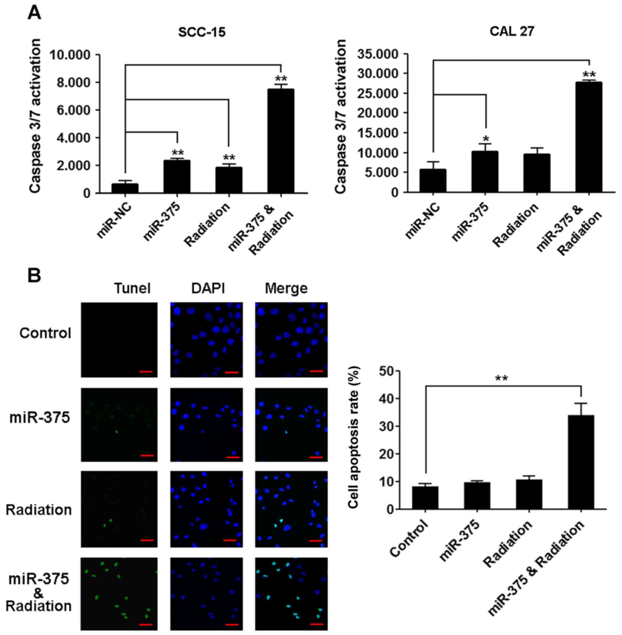 To determine whether miR-375 overexpression could increase radiosensitivity of TSCC cells, SCC-15 and CAL27 cells were transiently transfected with a control miRNA or miR-375 mimic, and their radiosensitivity was determined. The TSCC cells treated with irradiation or transfected with the miR-375 mimic did not significantly change the percentage of apoptotic cells compared with the control. However, combining overexpression of miR-375 with irradiation induced significant TSCC cell apoptosis compared with the control as revealed by the activity of caspase-3/7 (Fig. 5A) and TUNEL staining (Fig. 5B).