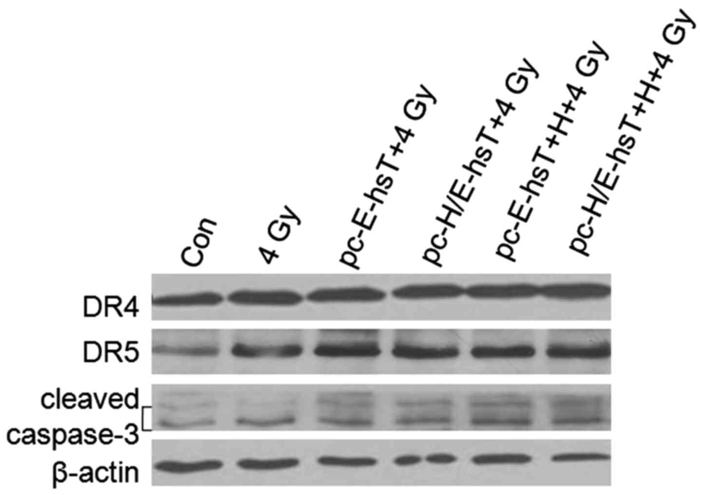 TRAIL and DR4, DR5 receptors regulated apoptosis upon caspase-8 or caspase-10 to caspase-3 pathways, caspase-3 cleaved fragments, then caused cell apoptosis (10). As shown (Fig. 5), 4 Gy irradiation caused DR4, DR5 and cleaved caspase-3 increase, DR4 had not obvious change in pc-E-hsT and pc-H/E-hsT transfected cells under normoxic and hypoxic condition. DR5 and cleaved caspase-3 increased mostly in pc-H/E-hsT transfected cells under hypoxic condition. These results also indicated TRAIL overexpression could induce A549 cell apoptosis, and its regulation was by TRAIL and DR5 to caspase-3 pathway, but not DR4.