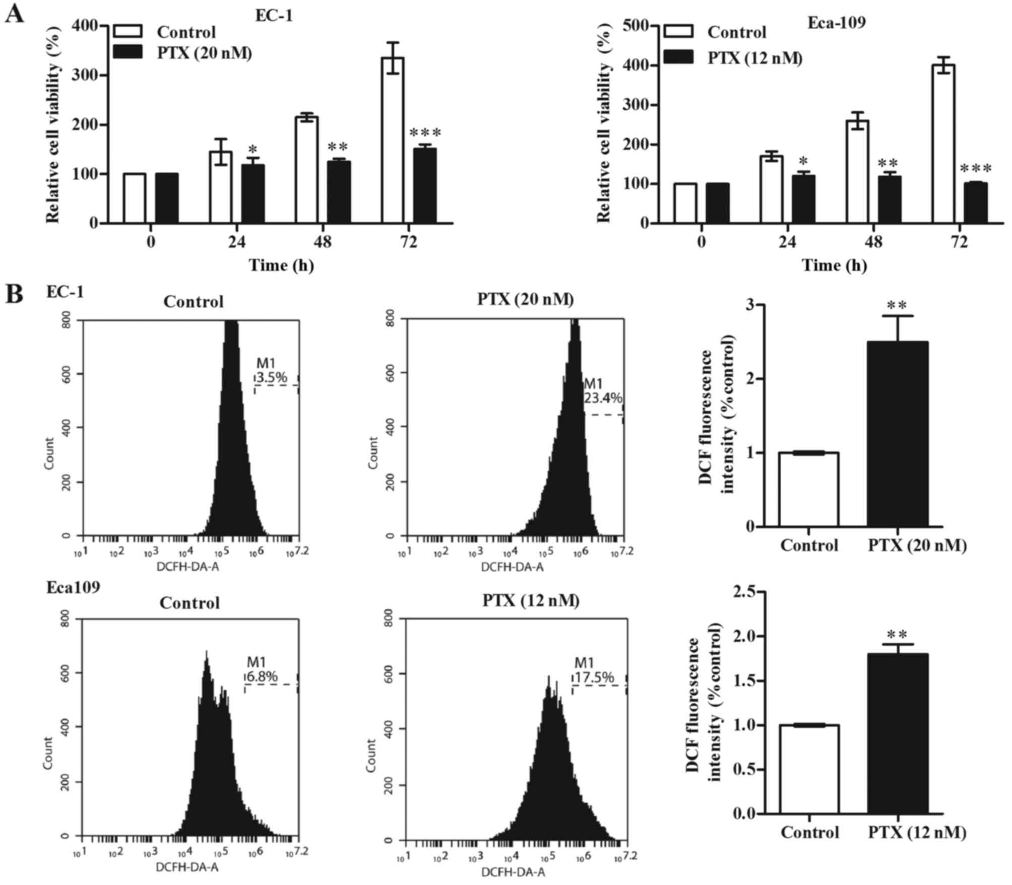 The anti-proliferative effect of paclitaxel on EC-1 and Eca-109 cells was determined by performing an MTT assay. We found that paclitaxel treatment reduced the ESCC cell viability in a time-dependent manner (Fig. 1A). In addition, we determined the intracellular ROS production induced by paclitaxel treatment, and our results showed that paclitaxel treatment significantly promoted ROS generation in EC-1 and Eca-109 cells (Fig. 1B).
