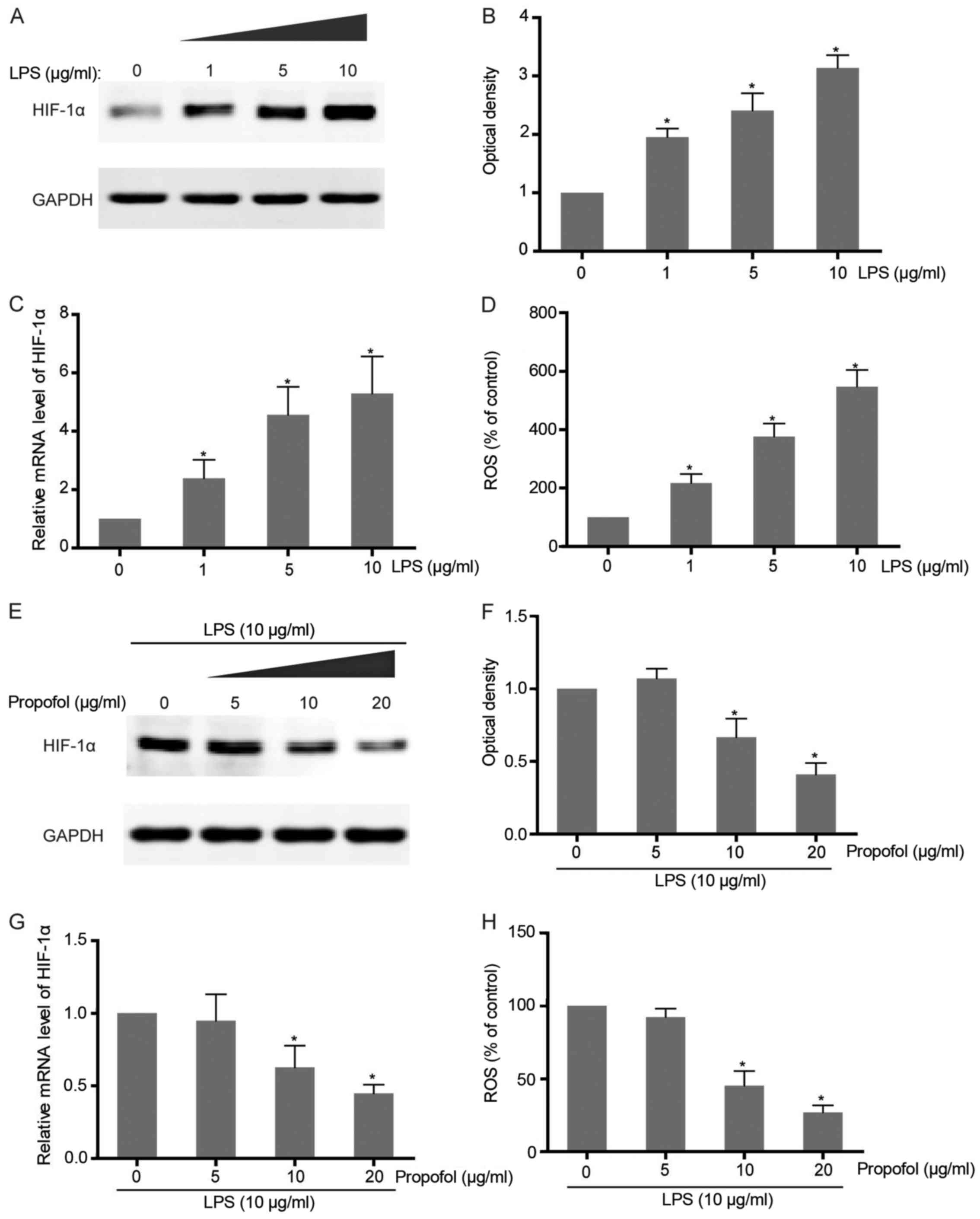 In addition to transcriptional regulation, the functions of HIF-1α depend on its protein stability and subcellular localization. Under a hypoxic condition, ubiquitination of HIF-1α is suppressed and increased HIF-1α binds to HIF-1β to form the HIF-1 transcription complex (30). HIF1 then translocates to the nucleus, where it binds to the hypoxic response element (HRE) within the promoters of its target genes (31,32). In the present study, LPS was found to enhance the stability of HIF-1α as well as its nuclear localization. Meanwhile, propofol impaired the effects of LPS on HIF-1α regulation. With regard to the promotive effect of ROS on activating HIF-1α, our findings suggested that propofol may disrupt the functions of HIF-1α via antagonizing LPS-induced ROS.