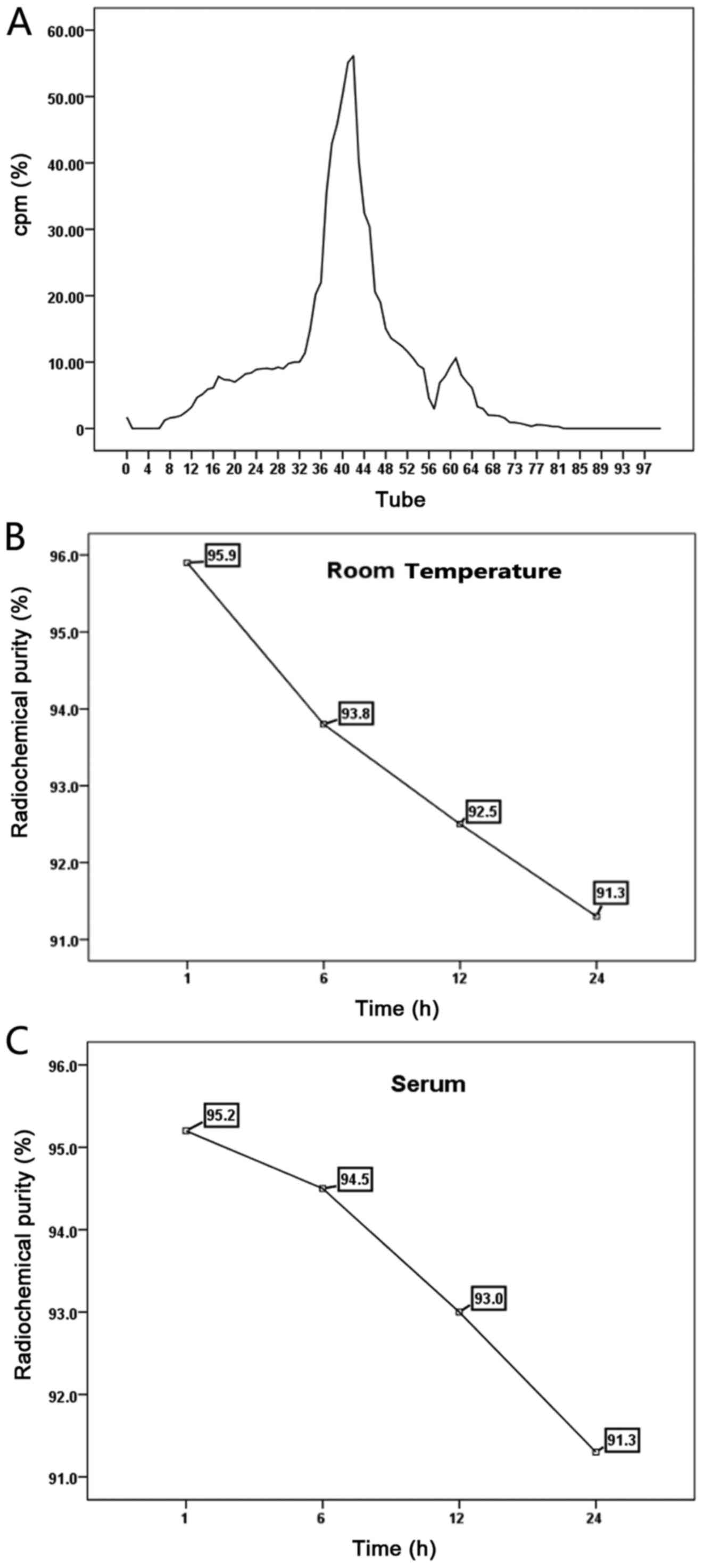 Recently, as phage-display technology has matured, our research group used this technique to establish an ATC phage antibody library and screen antibodies for ATC specificity. The biological characteristics of the antibodies were analyzed by ELISA, SDS-PAGE and western blotting. Results identified an antibody which exhibited specificity to ARO cells. Then, the purified scFv was labeled with 131I, the ARO cells were injected into nude mice in vivo, and a radioimmunoassay was successfully achieved. Use of the 131I-labeled polypeptide was feasible in the present study. The labeling rate of 131I-scFv was 91.64%, the radio-chemical purity of purified 131I-scFv was 93.3±0.32% and the radiochemical purity of 131I-scFv which was stored at 37̊C in human blood serum at 24 h was 91.9%. These results demonstrated that 131I-scFv had good stability in vitro, and met the requirements of in vivo experimental study on peptides (19). SPECT imaging can directly observe the dynamic changes in the in vivo distribution of the agents imaged. Results of 131I-scFv polypeptide imaging showed that, in nude mice xenografted with ARO cells, dynamic changes in distribution of the imaging agent in vivo can be directly observed using SPECT imaging, which is closer to clinical practice. Concentrations of radioactivity were not found in the thyroid at any time after injection mainly since the labeled compound targets the tumor vasculature with high affinity and specificity and is stable without iodothyronine. This is consistent with the results from the asssessment of the in vitro stability of 131I-scFv. SPECT imaging using 131I-scFv revealed a higher tumor uptake in the mice bearing ARO cells. The experimental results revealed that in tumor-bearing nude mice at 48 h after intravenous injection of 131I-scFv, the tumor imaging was clear. Concomitantly, the T/NT reached the highest value of 4.38, suggesting that the antibody bound specifically to ARO cells. The final objective of the imaging was to explore methods of treatment which could be used to target and destroy tumor cells by binding to the specific tumor antigen. 131I is a good imaging agent which is currently used in the clinical diagnosis and treatment of thyroid disease (20). If combined with the purified scFv, as used for imaging of tumor-bearing nude mice, it could provide a new way of diagnosing and treating ATC. In future our research may continue to focus on ATC treatment with 131I-scFv, to confirm the specific effect of 131I-scFv in killing tumor cells.