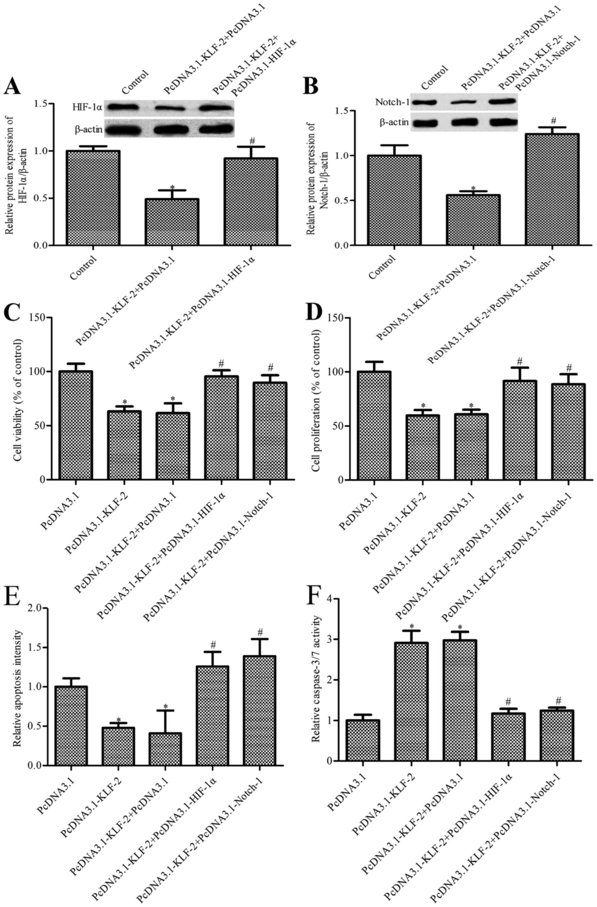 To further depict the function and mechanism of KLF2 overexpression in HCT116 cells, we constructed PcDNA3.1-KLF2 and PcDNA3.1-HIF-1α co-transfected cells, and PcDNA3.1-KLF2 and PcDNA3.1-Notch-1 co-transfected cells. The results in Fig. 5A and B have showed that compared with the PcDNA3.1-KLF2 + PcDNA3.1 group, the level of HIF-1α or Notch1 was markedly increased in the PcDNA3.1-KLF2 + PcDNA3.1-HIF-1α group or PcDNA3.1-KLF2 + PcDNA3.1-Notch1 group, respectively. Cell biology including viability, proliferation and apoptosis were measured. As shown in Fig. 5C and D, PcDNA3.1-KLF2 and PcDNA3.1-HIF-1α co-transfection or PcDNA3.1-KLF2 and PcDNA3.1-Notch-1 co-transfection strengthened HCT116 cell survival and proliferation compared with the PcDNA3.1-KLF2 group. We also found that HIF-1α overexpression or Notch-1 overexpression impaired the decrease of PcDNA3.1-KLF2 induced CRC cell apoptosis (Fig. 5E). Finally, caspase-3/7 level was determined, similarly to the above results; caspase-3/7 level in PcDNA3.1-KLF2 and PcDNA3.1-HIF-1α co-transfected or PcDNA3.1-KLF2 and PcDNA3.1-Notch-1 co-transfected group markedly decreased compared with the KLF2 overexpression group (Fig. 5F). The above results suggested that KLF2 overexpression regulates HCT116 cell growth, and apoptosis is dependent on the silencing of the HIF-1α/Notch-1 signal pathway.