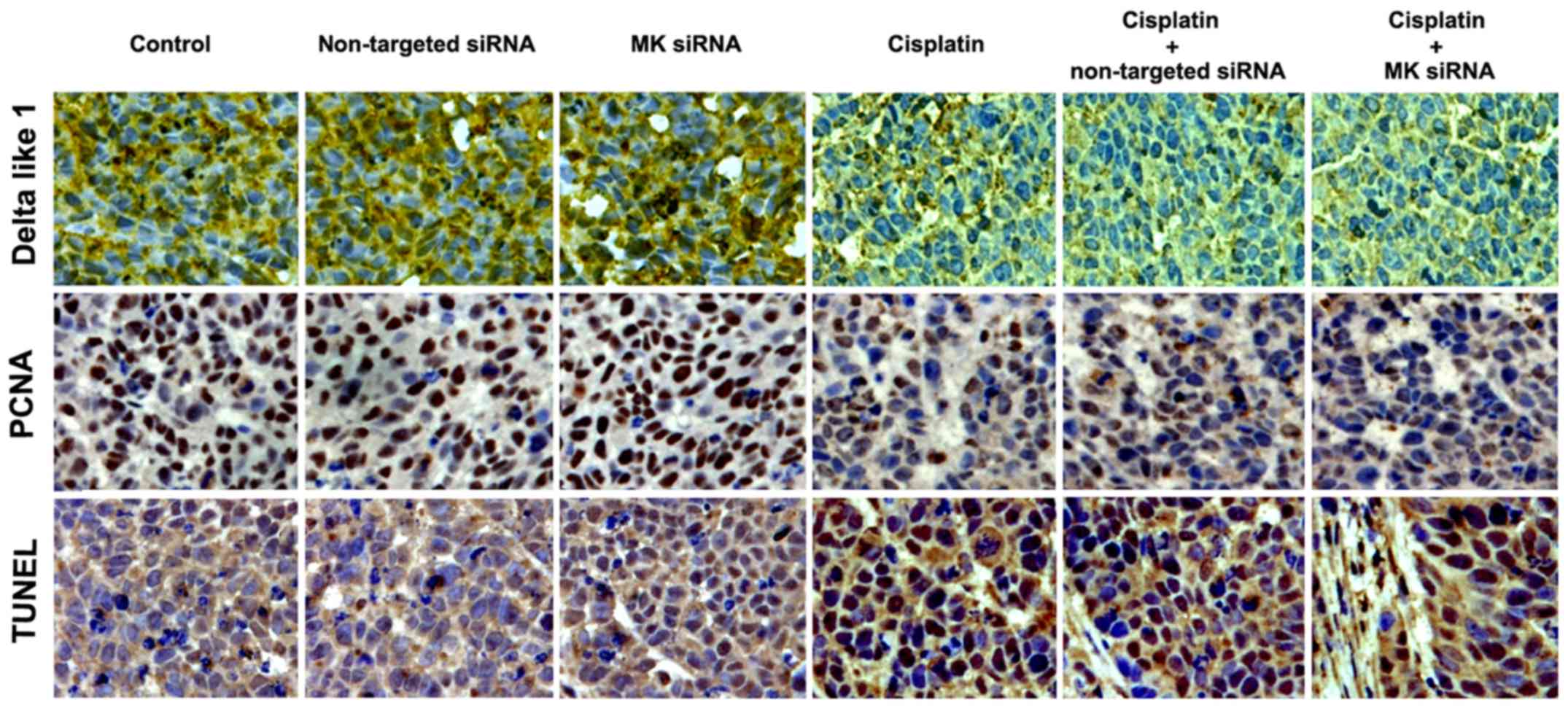 In conclusion, suppression of MK gene promoted the antitumoral effect of cisplatin on human gastric cell line AGS in vitro and in vivo. The downregulation of Notch signaling pathway-related proteins induced by suppressing MK gene is likely to be involved in modulating the cisplatin-induced apoptosis in gastric cancer cells.