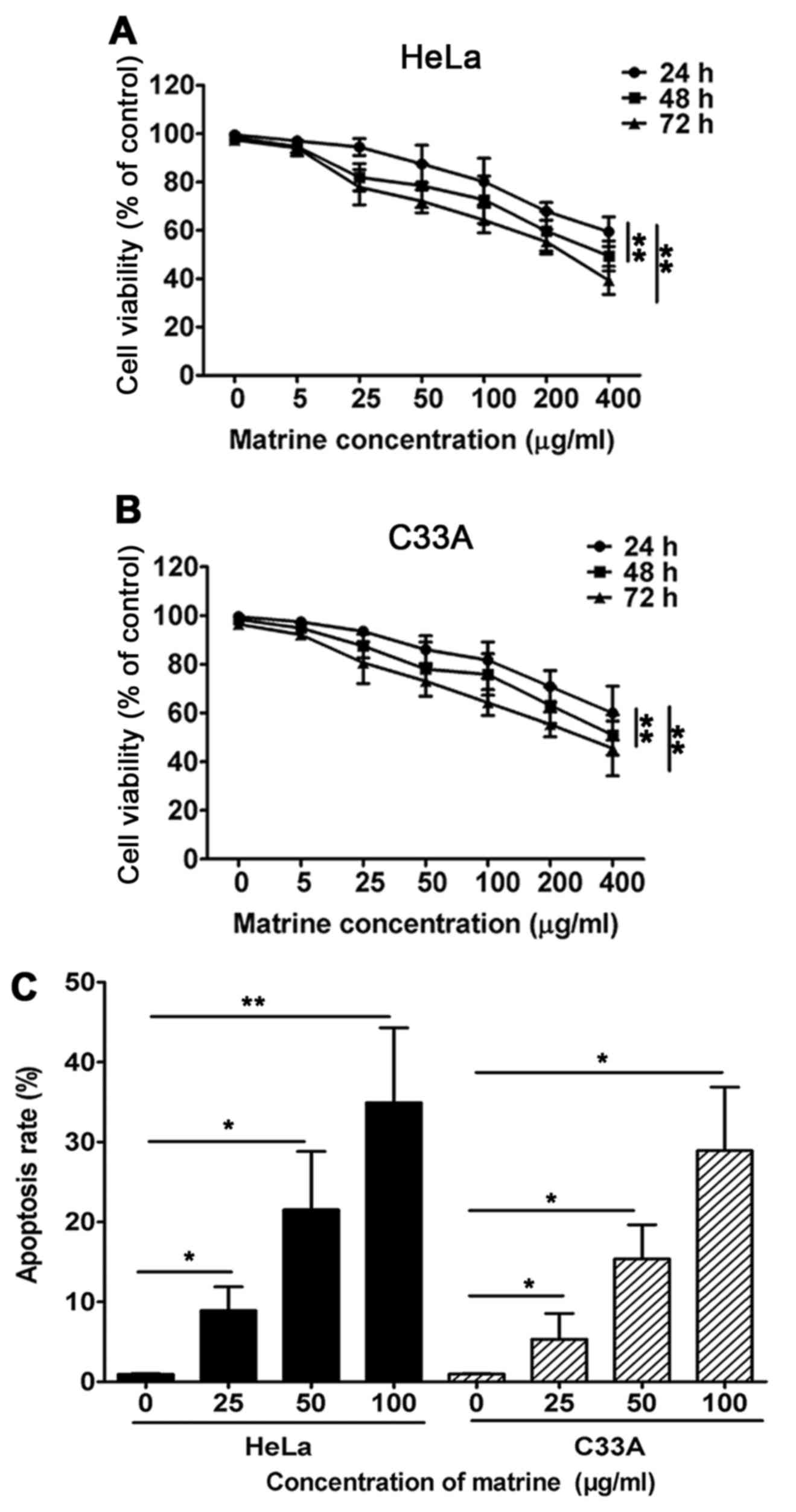 Wu, X., Zhou, J., Cai, D., Li, M."Matrine inhibits the metastatic properties of human cervical cancer cells via downregulating the p38 signaling pathway". Oncology Reports 38.2 (2017): 1312-1320.