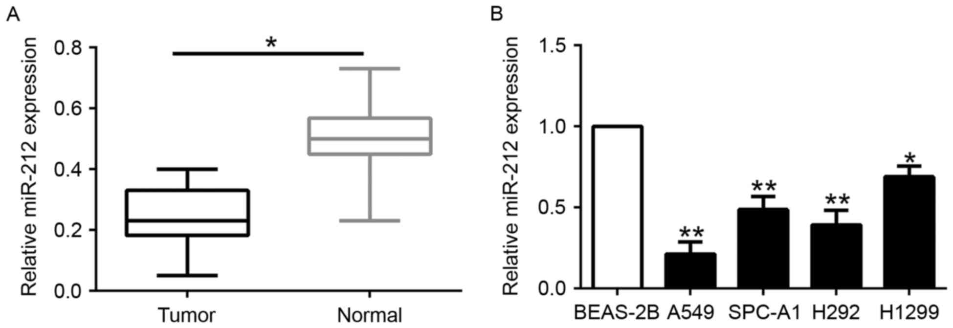 To determine the expression level of miR-212 in NSCLC, we first evaluated the expression of miR-212 in 115 paired NSCLC and adjacent normal lung tissues. miR-212 was significantly decreased in the NSCLC tissues compared to that noted in the matched tumor-adjacent tissues (P<0.05; Fig. 1A). Similarly, miR-212 was markedly downregulated in a panel of NSCLC cells (A549, SPC-A1, H292 and H1299) as compared to that observed in the normal lung epithelial cell line BEAS-2B (P<0.05; Fig. 1B). These data identified miR-212 as a tumor-suppressor of the progrssion of NSCLC.
