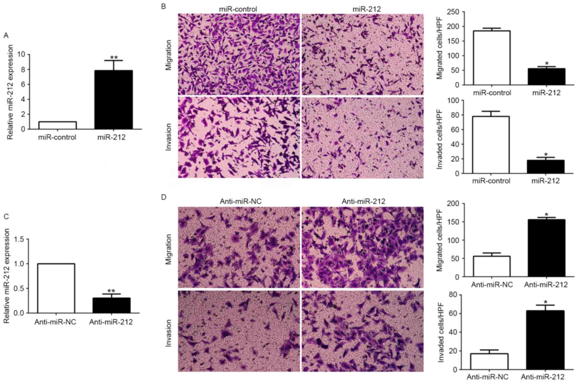 MicroRNAs (miRNAs) are a family of endogenous, short single-stranded and non-coding RNAs that negatively modulate gene expression by binding to the 3′-untranslated region (3′-UTR) of target mRNAs to cause degradation or inhibition of translation (9,10). Increasing evidence has confirmed that miRNAs play crucial roles in the physiological and pathological processes in NSCLC including cell differentiation, proliferation, apoptosis, migration and metastasis (11,12). Recently, miR-212, which is located on chromosome 17p13.3, was found to play a critical role in the progression of cancers, including NSCLC (13–16). Previous studies show that miR-212 functions as a regulator of cell invasion, metastasis, proliferation and drug sensitivity. miR-212 performs antimetastatic properties through suppression of SOX4 in breast cancer (17). miR-212 functions as an epigenetic-silenced tumor-suppressor involving in tumor metastasis and invasion of gastric cancer by downregulating PXN expression (18). Moreover, miR-212 inhibits glioblastoma cell proliferation by targeting SGK3 (19). However, the expression of miR-212 is upregulated in pancreatic, esophageal and prostate cancer. miR-212 promotes pancreatic cancer cell growth and invasion by targeting the Hedgehog signaling pathway receptor patched-1 (20). Overexpression of miR-212 predicts a poor prognosis of esophageal cancer patients (21). Thus, the functional significance of miR-212 in cancer initiation, development and process seems to be cancer-type specific. In regards to NSCLC, Li et al reported that miR-212 displays tumor-promoting properties in NSCLC cells and targets the Hedgehog pathway receptor PTCH1 (22); however, Lu et al demonstrated that miR-212 functions as a tumor suppressor in NSCLC by targeting synaptic acetylcholinesterase (23). The expression level of miR-212 and its function in NSCLC are contradictory. Therefore, it is important to identify the roles of miR-212 in NSCLC.