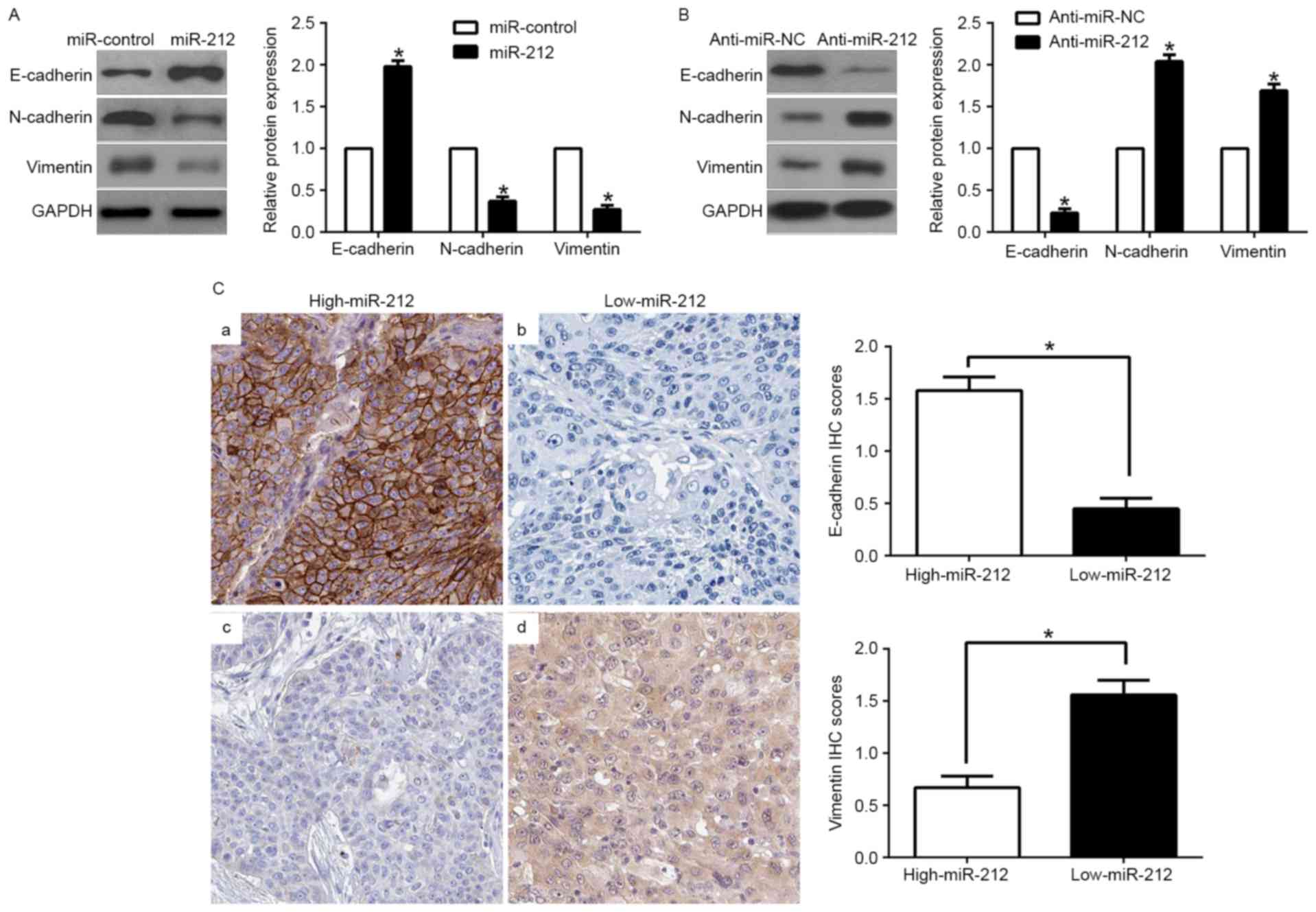 EMT has been identified as having a crucial role in the induction of metastatic progression of cancer (24). To investigate the potential role of miR-212 in modulating NSCLC metastasis, EMT markers were assessed. We found that miR-212 overexpression increased the epithelial marker E-cadherin and inhibited N-cadherin and vimentin expression (P<0.05; Fig. 4A). In contrast, miR-212 knockdown decreased E-cadherin expression and increased N-cadherin and vimentin expression (P<0.05; Fig. 4B). In addition, we further explored the correlation between miR-212 expression and EMT markers in NSCLC tissues. We found that the E-cadherin expression in the high miR-212 group was higher than that in the low miR-212 group. Conversely, the expression level of vimentin in the high miR-212 group was markedly lower than that in the low miR-212 group (P<0.05; Fig. 4C). Taken together, these results suggest that miR-212 functions as a suppressor of EMT in NSCLC cells.
