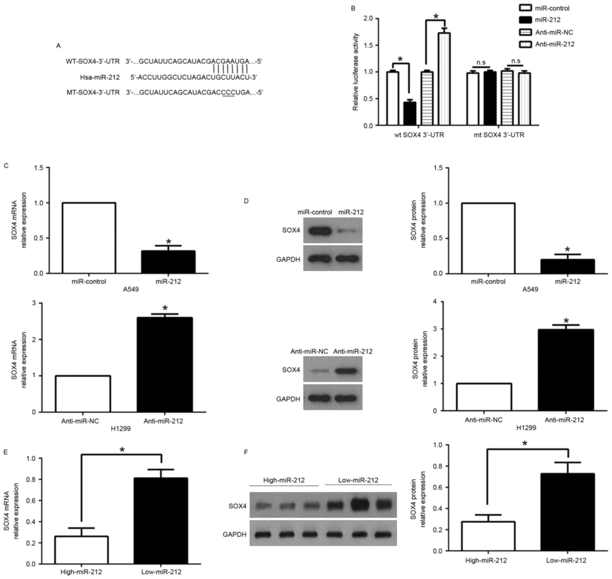 Subsequently, we examined the correlation between miR-212 expression and SOX4 in NSCLC tissues. We found that the expression of SOX4 mRNA and protein in the miR-212 high-expressing tumors were significantly lower than those in the miR-212 low-expressing tumors (P<0.05, respectively; Fig. 5E and F). Taken together, these results suggest that miR-212 inhibits SOX4 expression by direct binding to the 3′-UTR of SOX4.