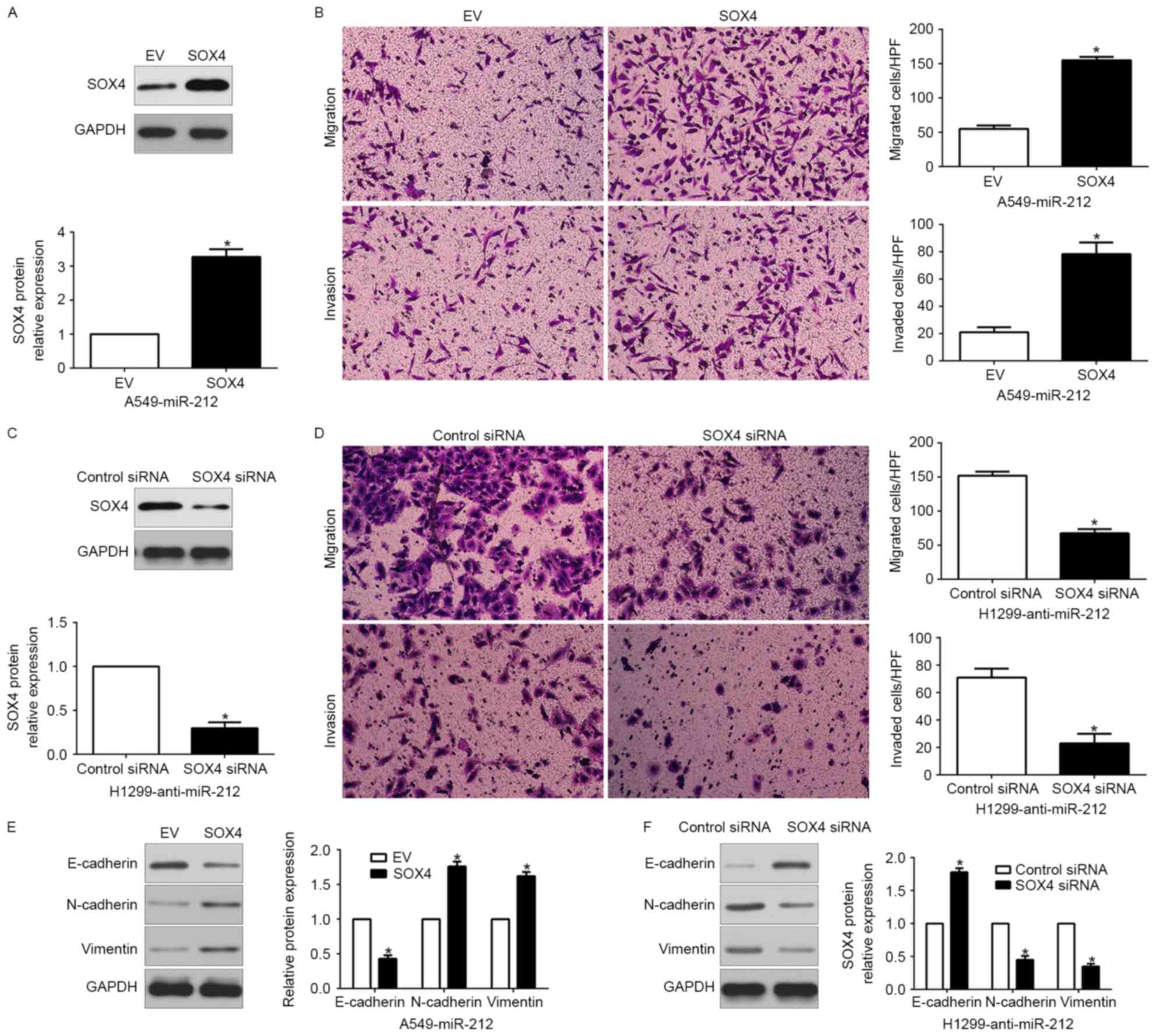 In summary, we demonstrated that miR-212 was downregulated in NSCLC tissues and cell lines, and its expression was correlated with malignant clinicopathological features. Furthermore, we confirmed that overexpression of miR-212 inhibited cell migration and invasion in vitro by inhibiting SOX4-mediated EMT signaling pathway. These results suggest that miR-212 is a potential invasion-associated tumor suppressor in NSCLC. In the future, therapeutic interventions concentrating on miR-212-SOX4 may help suppress the development and metastasis of NSCLC.