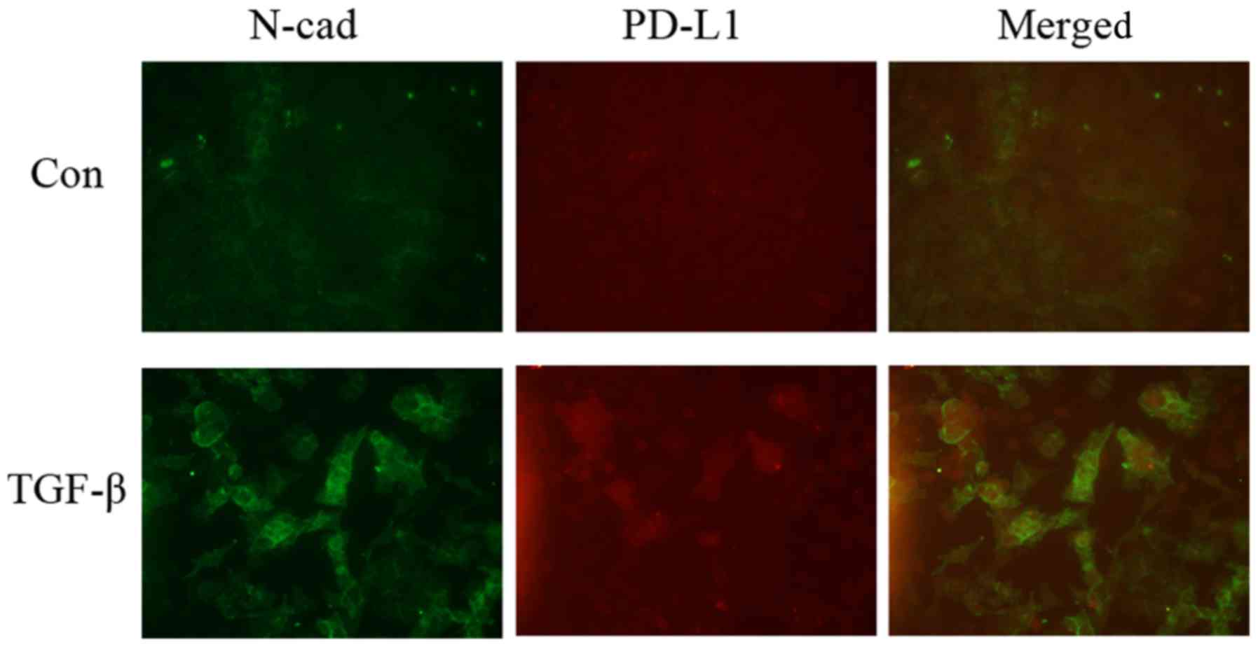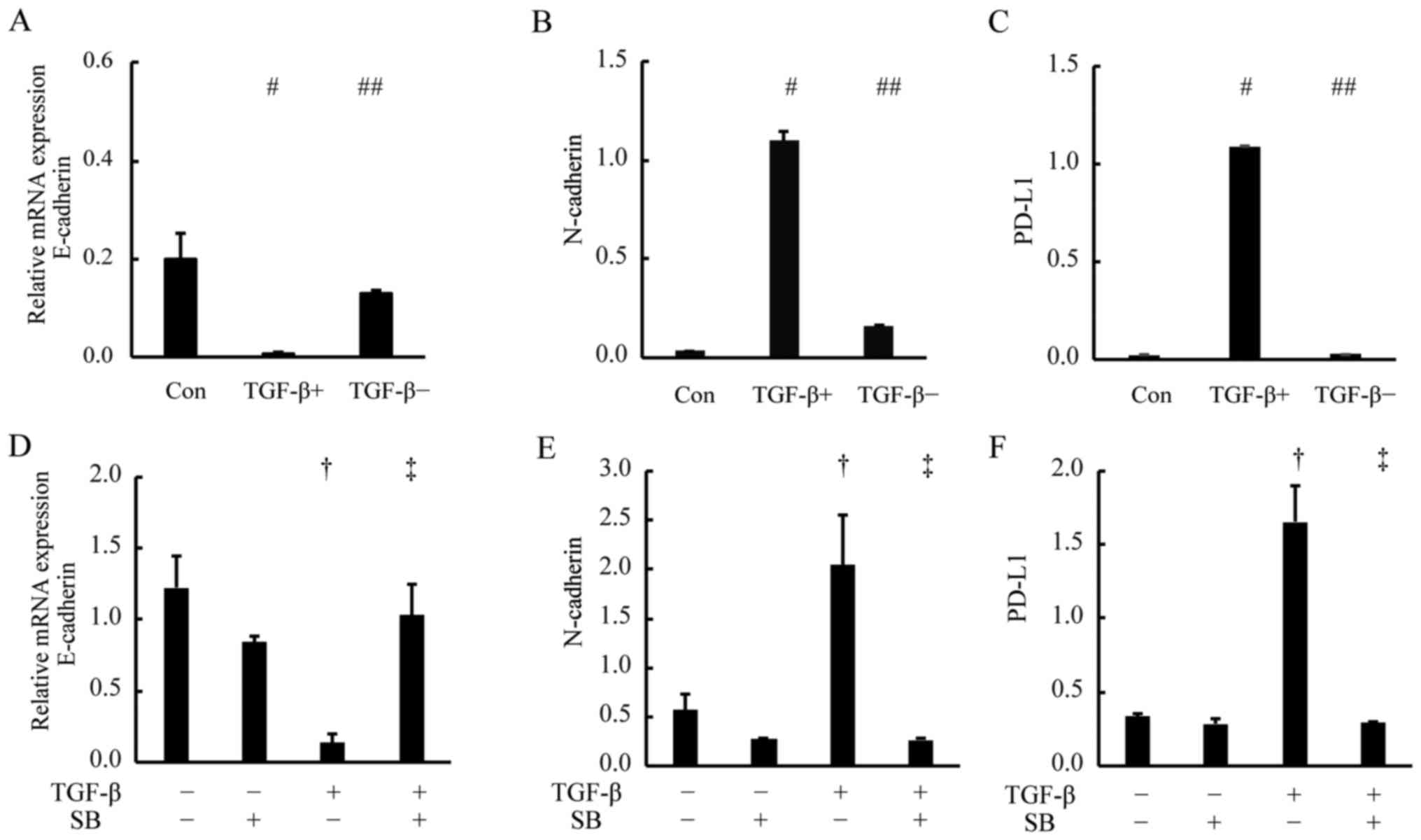EMT plays a crucial role in cancer progression, and this phenomenon can be found in this cancer microenvironment. EMT is promoted by TGF-β secreted from not only the cancer cell itself but also from other cell types, and it gives cancer cells the invasive and metastatic abilities necessary for successful metastasis (7,8,12,17). In the present study, we demonstrated that PD-L1 expression in cancer cells was regulated by TGF-β signal pathway. Other groups showed a significant relationship between PD-L1 expression and EMT status by IHC staining analysis on several malignancies including NSCLC (18,19). Together, these data support our notion that the TGF-β pathway is an important regulator of PD-L1 expression, and EMT markers may be useful for selecting patients that would likely benefit from immunotherapy.