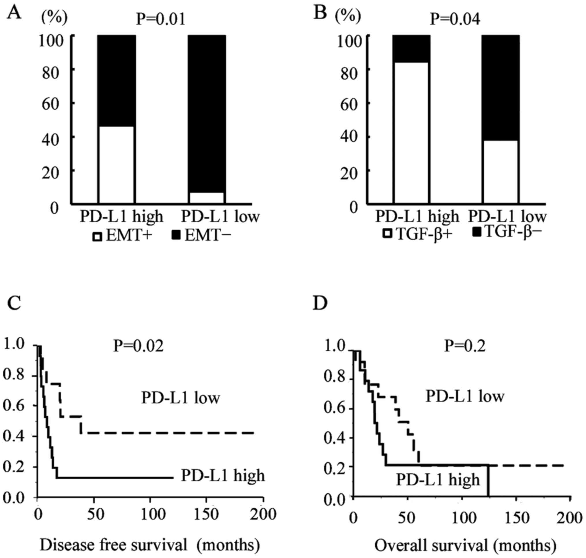 In the present study, we showed that PD-L1 was regulated by TGF-β, and that chemo-treatment enhanced the PD-L1 expression through the chemo-induced TGF-β signal pathway in NSCLC cell lines. We also performed IHC staining of surgically resected NSCLC after induction chemotherapy and thus revealed a significant relationship between PD-L1 expression and EMT status.