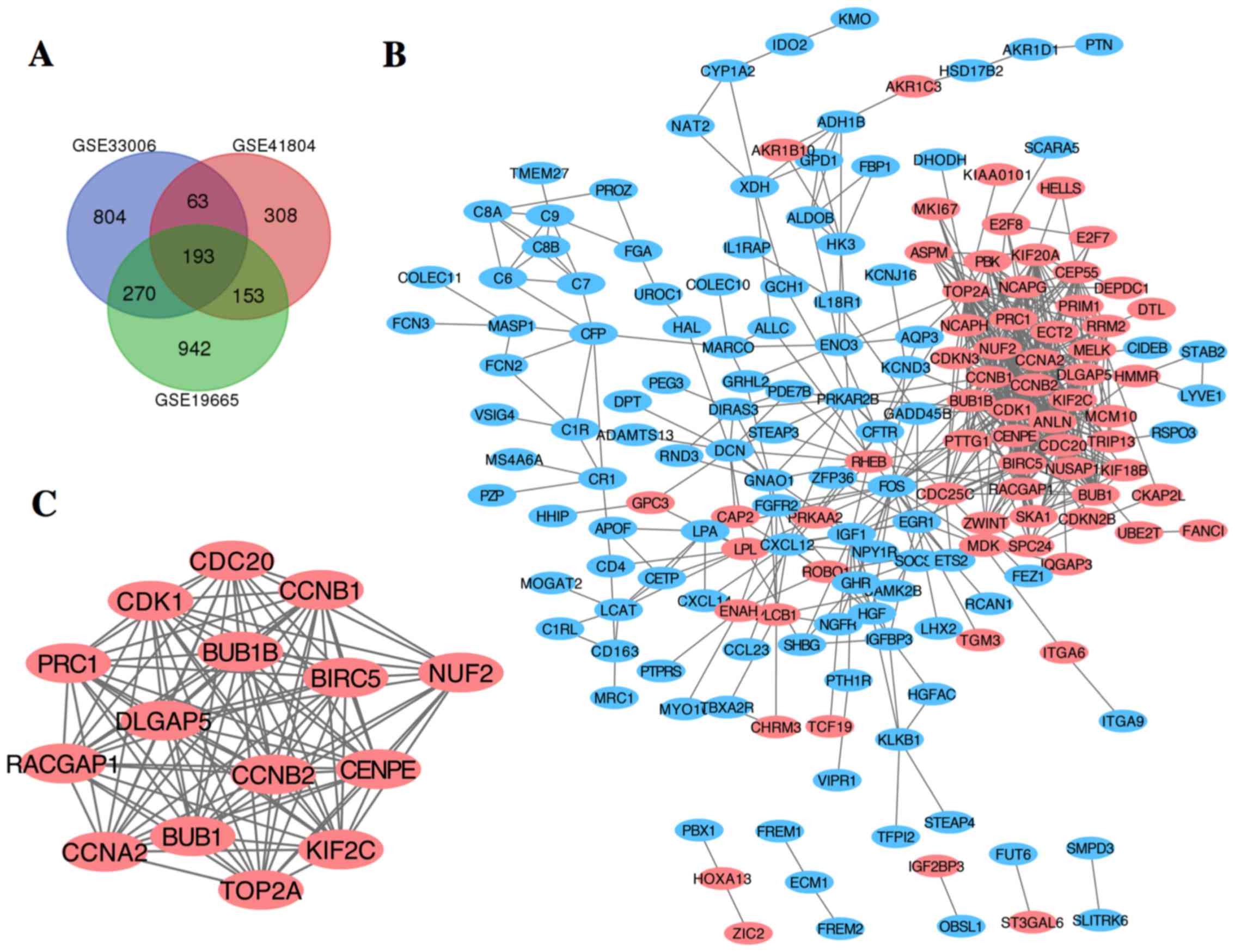 In the present study, 3 mRNA microarray datasets were analyzed to obtain DEGs between liver cancer tissues and non-cancerous tissues. A total of 273 DEGs were identified among the 3 datasets, including 189 downregulated genes and 84 upregulated genes. GO and KEGG enrichment analyses were performed to explore interactions among the DEGs. The upregulated genes were mainly enriched in oocyte meiosis, mitotic cell cycle and cell cycle, while the downregulated genes were mainly enriched in protein activation cascade, complement activation and complement and coagulation cascades. Previous studies have reported that dysregulation of the cell cycle process and mitotic cell cycle play important roles in the carcinogenesis or progression of tumors (24,25,29). In addition, recent studies have brought forward a tumor-promoting role for complement activation (30). Moreover, oxidoreductase activity often plays a major role in antioxidant defense and can encode tumor suppressors that are frequently altered in tumors (31,32). In a word, all these theories are consistent with our results. GO enrichment analysis revealed that changes in the most significant modules were mainly enriched in cell division, nuclear division and mitotic cell cycle process, while changes in KEGG were mainly enriched in cell cycle, progesterone-mediated oocyte maturation and oocyte meiosis.