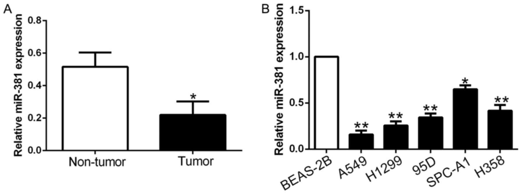 To determine the expression level of miR-381 in NSCLC, we performed qRT-PCR to detect miR-381 expression in 124 paired NSCLC tissues and adjacent non-tumor tissues. The results showed that miR-381 was significantly decreased in NSCLC tissues compared to adjacent non-tumor tissues (P<0.05, Fig. 1A). Besides, miR-381 expression was significantly downregulated in all NSCLC cell lines (A549, H1299, 95D, SPC-A1 and H358) compared with normal lung epithelial cell line BEAS-2B (P<0.05, Fig. 1B). Taken together, these data suggest that reduced miR-381 may be associated with NSCLC carcinogenesis and development.