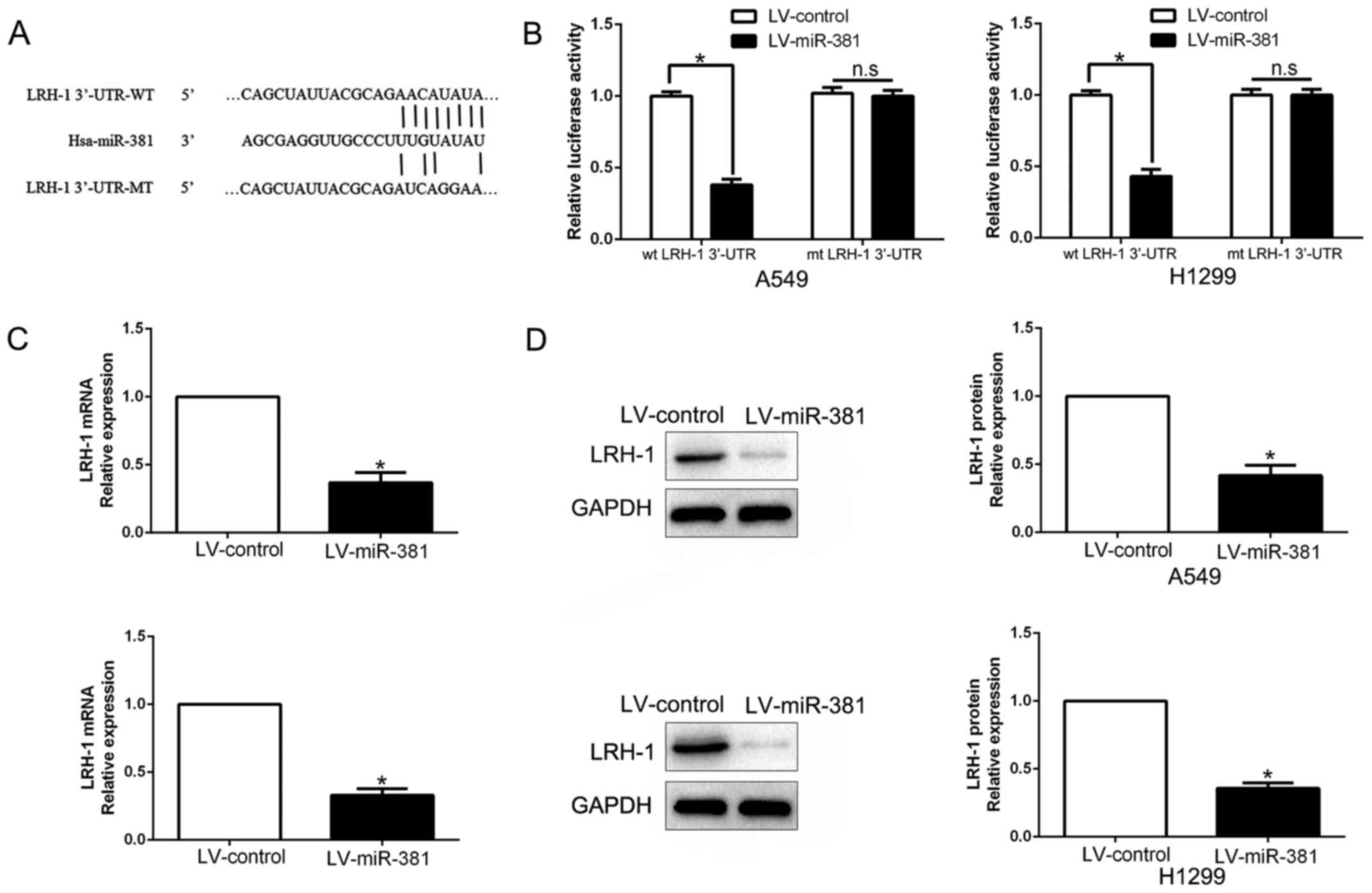 miR-381 lentiviral expression or control vector were obtained from the company of GeneCopoeia. LRH-1 overexpression plasmid or control plasmid were purchased from Ruibo (Guangzhou, China). The tranfection of these vectors into NSCLC cells were performed in 6-well plates with Lipofectamine 2000 (Invitrogen, Carlsbad, CA, USA) based on the instruction from manufacturer.