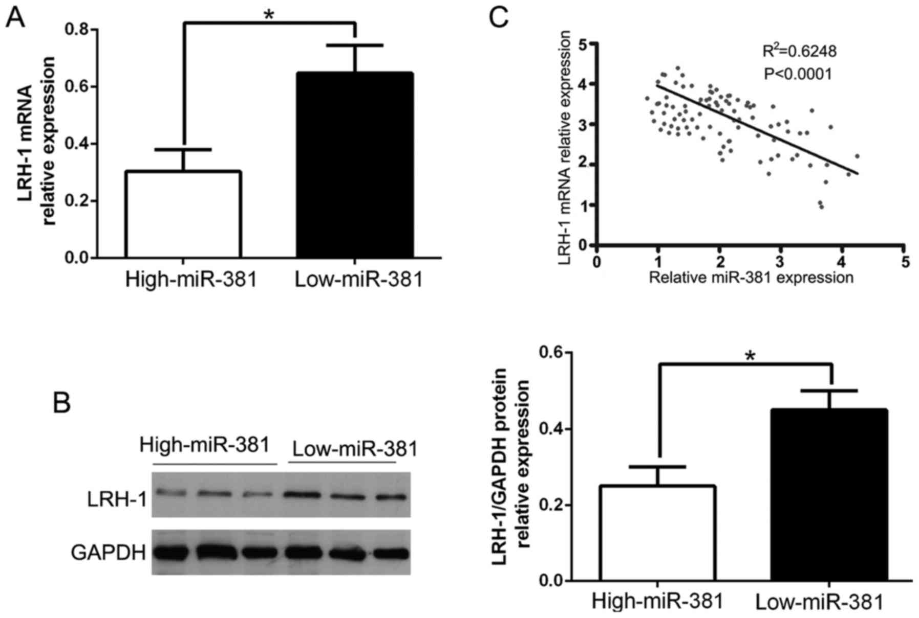 To further confirm the above data which suggest LRH-1 was a direct target of miR-381, we performed qRT-PCR to explore the LRH-1 expression in NSCLC tissues. Our data revealed that LRH-1 mRNA and protein levels were significantly lower in high miR-381 group than that in low miR-381 group in NSCLC (P<0.05, Fig. 5A and B). Moreover, the results showed that the mRNA level of LRH-1 in the NSCLC tissues was inversely correlated with miR-381 expression (R2=0.6248, P<0.0001, Fig. 5C). Taken together, these data indicated that LRH-1 was a direct downstream target of miR-381 in NSCLC tissues.