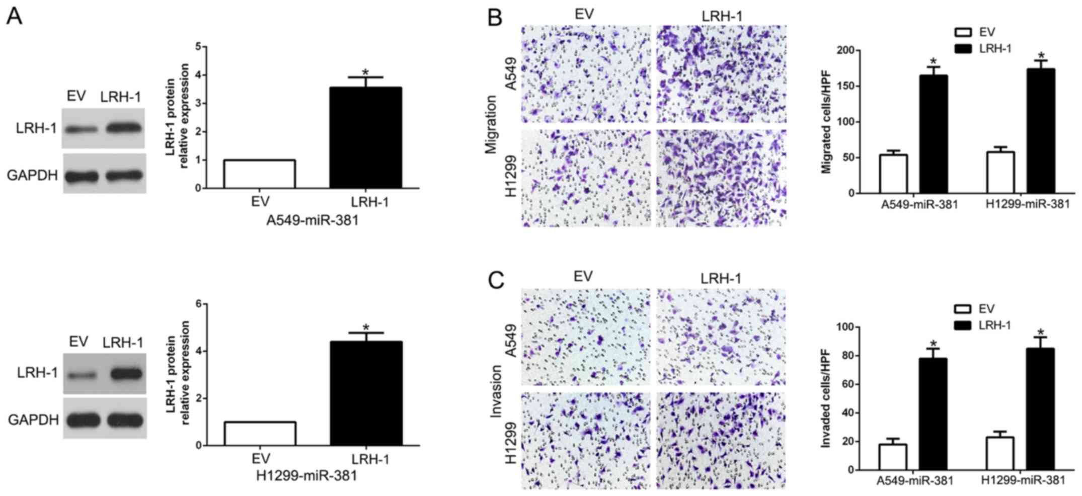 To further confirm LRH-1 was a functional target and was involved in miR-381-mediated biological effects, we restored LRH-1 expression in A549-miR-381 and H1299-miR-381 cells by transfecting LRH-1 expression plasmid (P<0.05, Fig. 6A). Furthermore, Transwell assay showed that LRH-1 overexpression promoted cell migration (P<0.05, Fig. 6B) and invasion (P<0.05, Fig. 6C), which abolished the suppressive effects of miR-381 on A549 and H1299 cells. These data demonstrated that LRH-1 mediates the functional effects of miR-381 on migration and invasion in NSCLC cells.