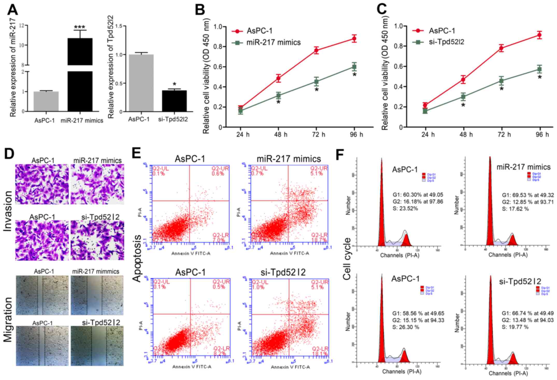 To investigate the biological functions of Tpd52l2 in HPAC cells, endogenous Tpd52l2 was knocked down in AsPC-1 cells with specific siRNAs against Tpd52l2 (si-Tpd52l2). In addition, miR-217 mimics were transfected into AsPC-1 cells. We found that the mRNA level of miR-217 was increased by miR-217 mimic transfection, and Tpd52l2 was significantly inhibited in AsPC-1 cells by si-Tpd52l2 (Fig. 3A). Overexpression of miR-217 in AsPC-1 cells significantly inhibited cell proliferation (Fig. 3B), invasion and migration (Fig. 3D), induced apoptosis (Fig. 3E) and caused cell cycle arrest at the G0/G1 phase (Fig. 3F). Similarly, downregulation of Tpd52l2 in AsPC-1 cells significantly inhibited cell proliferation (Fig. 3C), invasion and migration (Fig. 3D), induced apoptosis (Fig. 3E) and cell cycle arrest (Fig. 3F). These results suggest that silencing of Tpd52l2 had a similar effect as miR-217 overexpression in the HPAC cells.