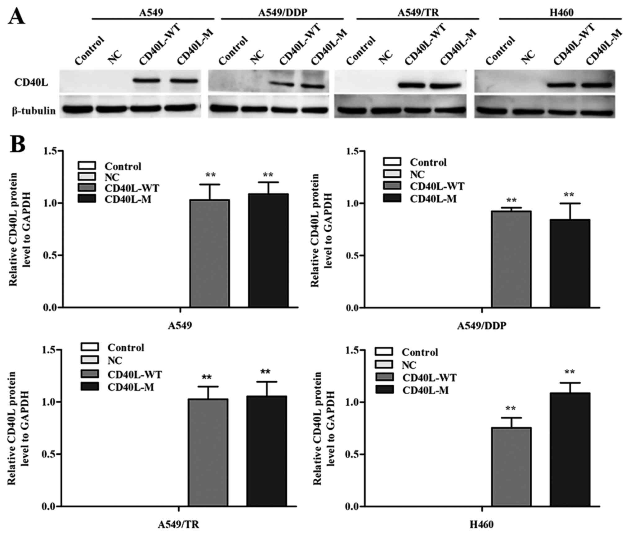Human CD40-positive lung adenocarcinoma cell lines A549 and H460 and human bronchial 16HBE epithelial cell line were purchased from the Cell Resource Center (Shanghai Institutes for Biological Sciences, Shanghai, China). The cisplatin-resistant A549 (A549/DDP) and paclitaxel-resistant A549 (A549/TR) cell lines were kindly provided by Professor Zhou at the Shanghai Pulmonary Hospital. All cell lines were maintained at 37°C in a 5% CO2 atmosphere in Dulbecco's modified Eagle's medium (DMEM) containing 10% fetal bovine serum (FBS; ScienCell Research Laboratories, San Diego, CA, USA), 100 U/ml penicillin and 100 µg/ml streptomycin. To maintain drug resistance, A549/DDP and A549/TR cells were grown in DMEM containing 6.67 µM cisplatin or 0.23 µM paclitaxel (Taxol®) (Sigma-Aldrich; Merck KGaA, Darmstadt, Germany) respectively, and then in drug-free DMEM two days before the experiments. We previously constructed a plasmid expressing CD40L-M, which contained 6 substitutions (Gln114 to Pro114, Lys115 to Arg115, Asp117 to Glu117, Gln118 to Glu118, Asn119 to Asp119 and Pro120 to Ser120) by Invitrogen Biotechnology (Shanghai, China). A549/TR, A549/DDP, H460 and A549 cells were transfected with an entry vector pcDNA3.1+, pcDNA3.1+-CD40L-WT or pcDNA3.1+-CD40L-M according to a previously described method (12). The ATM inhibitor KU-55933 was obtained from Selleck Chemicals (Houston, TX, USA).