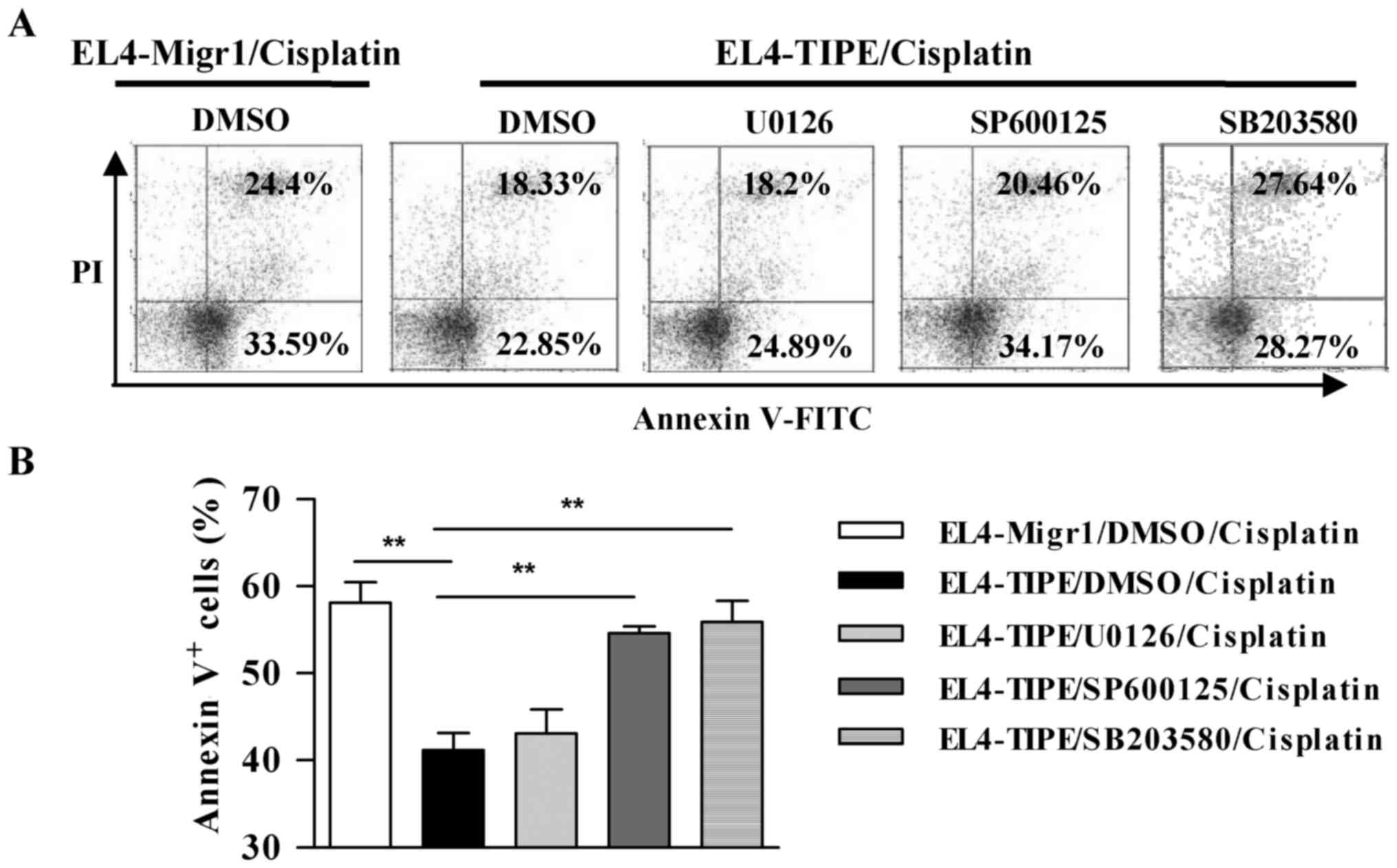 As TIPE overexpression efficiently increased cell survival (Fig. 2) and obviously augmented MAPK activation (Fig. 3), we aimed to ascertain whether the TIPE-mediated anti-apoptotic effects were due to the activation of these kinases. Toward this end, TIPE-overexpressing and Migr1 control EL4 cells were incubated with related kinase inhibitors prior to cisplatin treatment and apoptotic cells were determined by flow cytometry. Compared with the Migr1 control, TIPE overexpression efficiently inhibited cisplatin-induced cell apoptosis, which was confirmed by reduction in apoptotic cells from 58 to 41.18% (Fig. 4A and B). Compared with the U0126-treated group, inhibition of JNK phosphorylation by JNK inhibitor SP600125 efficiently abolished the promotive effect of TIPE on cell survival, which was confirmed by the increase in the percentages of apoptotic cells from 41.18 to 54.63% (Fig. 4). Treatment with SB203580 also showed a similar trend (Fig. 4). All these observations suggest that the activation of JNK, p38, but not MEK contributes to the anti-apoptotic effect of TIPE overexpression.
