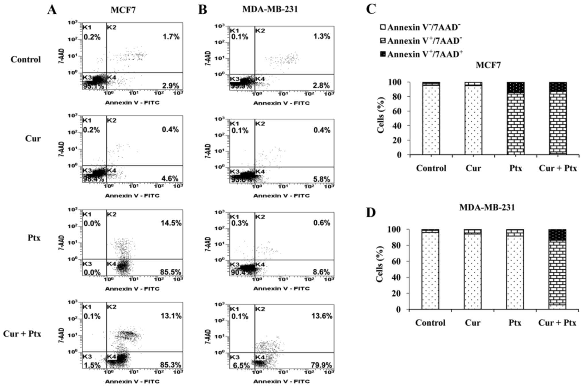 The loss of membrane integrity was analyzed by 7-AAD/Annexin V assay (Fig. 2A-D). As shown in Fig. 2A and C, paclitaxel or the combined treatment induced increased levels of apoptosis (85.5 and 85.3%, respectively) compared with curcumin alone (4.6%) in the MCF7 cell line. In contrast, no significant effect on apoptosis was observed following paclitaxel or curcumin treatment in the MDA-MB-231 cell line compared with the control (Fig. 2B). However, combined treatment with paclitaxel and curcumin induced 79.9% apoptosis (Fig. 2B and D). However, necrosis was not observed in these two cell lines.