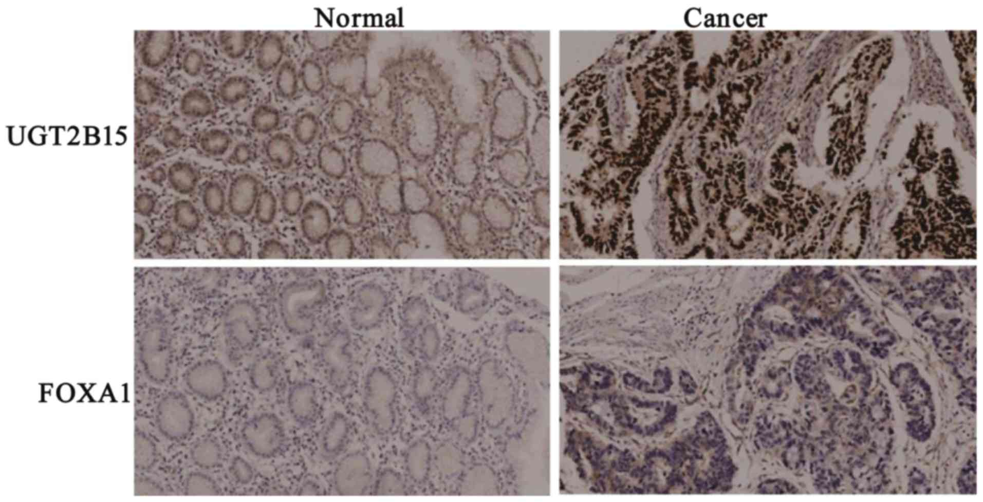 Clinical data and FOXA1 mRNA expression data were obtained from the TCGA dataset, providing 354 GC tissues and 32 non-cancerous gastric tissues (data not shown). Results showed that FOXA1 was upregulated in GC tissues compared to non-cancerous gastric tissues (P=0.0005) (Fig. 6B). The Pearson correlation coefficient confirmed that UGT2B15 and FOXA1 were positively correlated in GC tissues (R=0.2, P=0.008) (Fig. 6C). Immunohistochemistry was performed on 32 pairs of GC and adjacent non-tumorous tissues to confirm UGT2B15 and Foxa1 protein expression. Our results demonstrated the upregulation of both UGT2B15 protein and Foxa1 protein in GC tissues (Fig. 7).