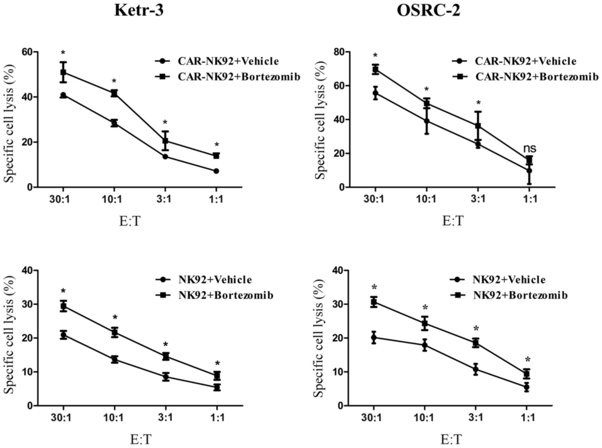 In conclusion, we constructed a third-generation CAR against the RCC antigen CAIX. Our results revealed that CAIX-specific CAR-NK92 cells have great potential to kill RCC cells, and combination with bortezomib enhanced the effects of CAR-NK92 cells against RCC in vitro and in vivo. The present study is based on the NK92 cell line. Future studies of this regimen can also be expanded to autologous or allogeneic primary NK or T cells. This study provides an experimental basis for the novel clinical regimen of CAIX-specific CAR-modified NK or T cells for the treatment of RCC.