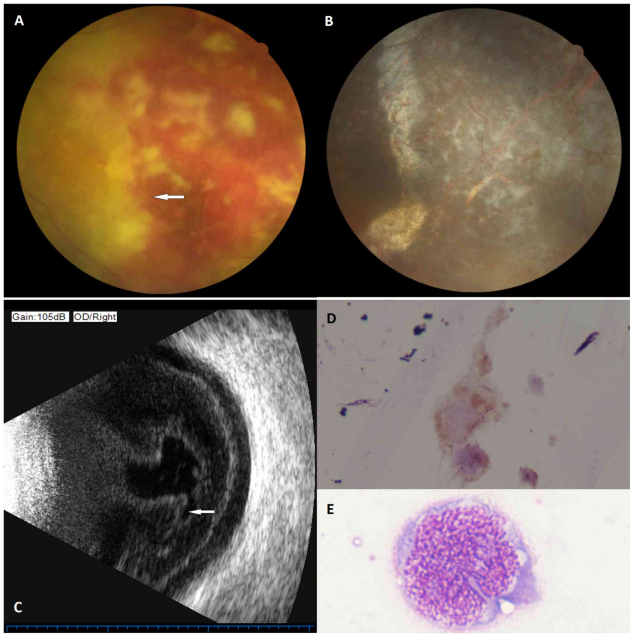 IOL is a typical masquerade syndrome and shares some symptoms, such as floaters and blurred vision, with posterior uveitis, vitritis and retinitis (3). These shared symptoms can result in difficult or delayed diagnoses. Approximately 80% of patients with IOL have bilateral eye involvement (4). Although examinations, including optical coherence tomography (OCT) and B-type ultrasonography can provide valuable insight for diagnosis, cytological analysis is an indispensable method for diagnostic confirmation. The main pathological type is diffuse large B cell lymphoma.