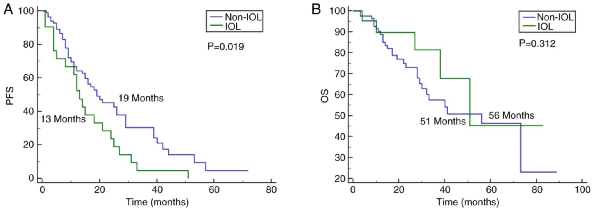 The survival outcomes of patients with PCNSL with intraocular involvement are controversial. The PFS and OS rates in the reported studies vary widely and have clear variations. The main reason for these different survival outcomes is the heterogeneity of both the inclusion criteria and patient evaluation. Furthermore, the diagnostic criteria for IOL varies across different studies due to a lack of standardization. Grimm et al (14) reported that patients with PCNSL with and without intraocular involvement had similar PFS and OS rates; however, their study only included patients with ocular and parenchymal involvement at diagnosis. Kreher et al (15) demonstrated that patients with IOL had significantly inferior PFS and OS rates compared with non-IOL patients. In this study, not all patients received an ophthalmological evaluation. In the IOL group in this study, we included patients who presented with intraocular involvement either at initial diagnosis or during the course of the disease. Patients with IOL had an inferior PFS, but similar OS compared with those in the non-IOL group, and this difference may have been obtained for the following reasons: i) Many other factors may influence OS; ii) we changed systemic therapeutic regimens after disease relapse, which may improve the outcomes to a certain extent; iii) eye-specific therapy was used in some patients with IOL, which helped decrease the additional tumor burden; and iv) the median follow-up time was too short to identify the differences. Due to the rarity of the disease, further studies are warranted to confirm our results.