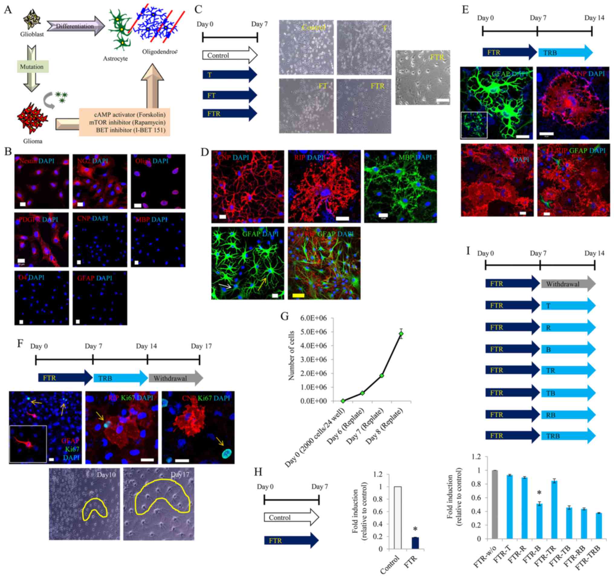 Our findings suggest that malignant gliomas, derived from mutations in glial precursor cells, can be converted to non-proliferating glial cells with glial-specific characteristics. Moreover, the proliferation of malignant cells can be highly suppressed by the combination treatment of a cAMP activator, mTOR inhibitor and BET inhibitor. In future, we will continue to investigate the genes that are specifically involved in glial differentiation of glioma.