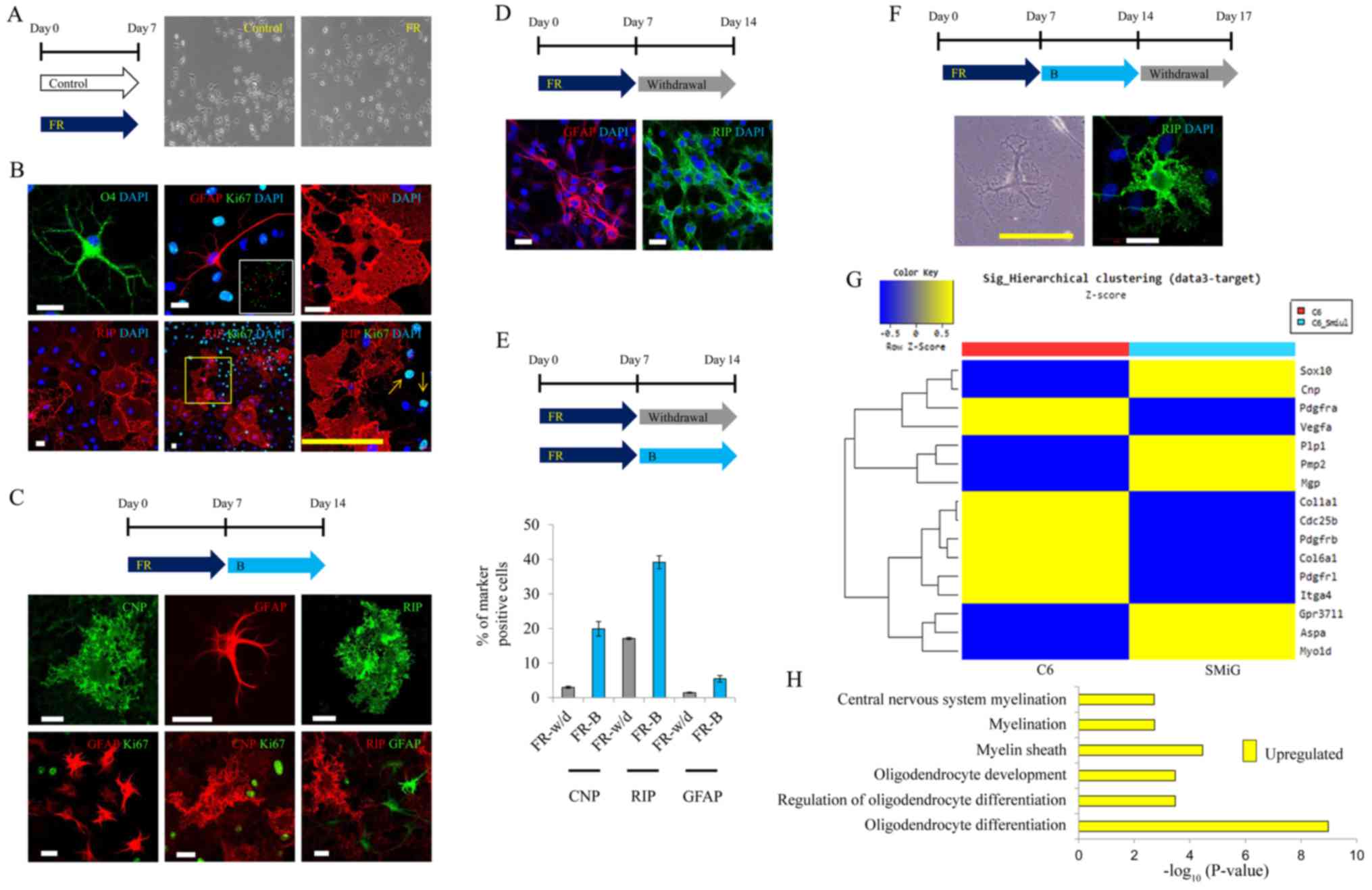 Therefore, we aimed to ascertain whether T3, which is typically used to differentiate glial progenitor cells into oligodendrocytes, could convert gliomas into glial cells (i.e., oligodendrocytes). However, the T3-treated glioma cells were not transformed into a glial-specific morphology (Fig. 1C). Next, we added T3 and forskolin to the glioma cells, but could not confirm glial-specific morphology until 7 days of incubation (Fig. 1C). Nevertheless, we persisted in our efforts to convert C6 glioma cells into glial cells by adding rapamycin to T3 and forskolin, and incubating the cells for 7 days. With this, we were finally able to observe glial-specific morphology (Fig. 1C), as well as glial-specific markers such as GFAP, CNP, and RIP (Fig. 1D).