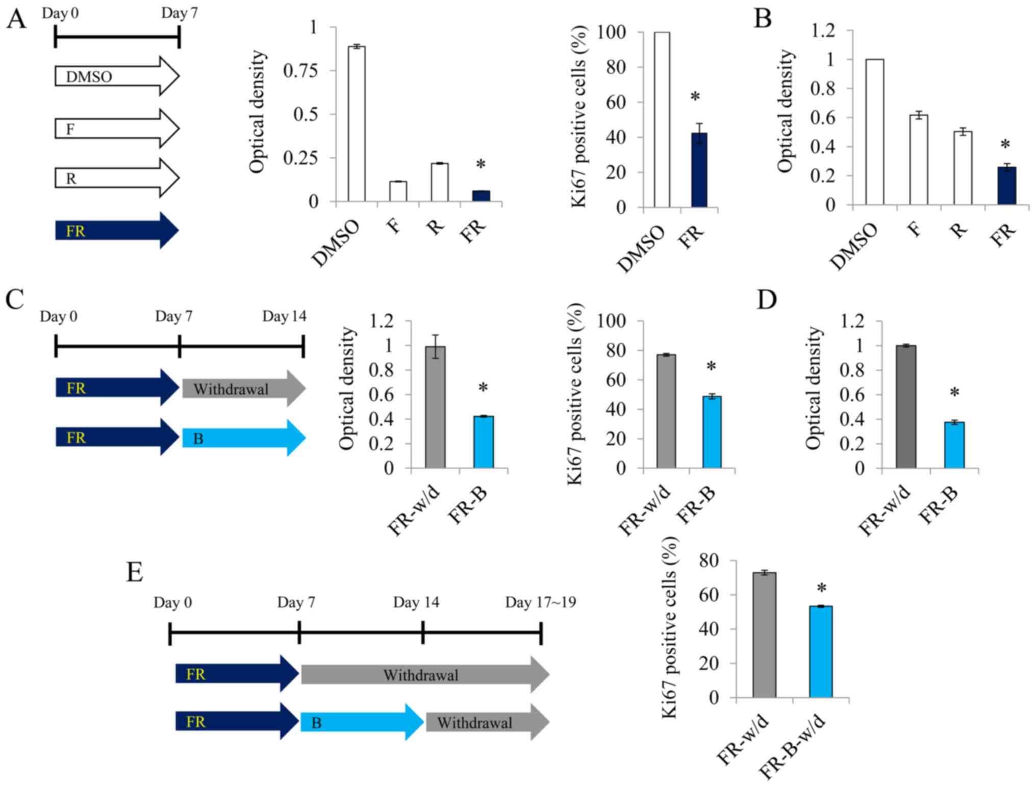BET inhibitor was classified as an anticancer agent after clinical trials in the United States and Europe (18,19). In this study, a BET (bromodomain and extra-terminal motif) inhibitor, I-BET151, was added to the media 7 days after the induction of glial differentiation, using a combination of forskolin and rapamycin. Treatment with I-BET151 not only helped to maintain the glial-specific morphology, but also strongly inhibited cell proliferation (Fig. 2C-F). According to a previous study, the BET inhibitor accelerates the differentiation of mouse primary glial progenitors into oligodendrocytes (20). To the best of our knowledge, this is the first study that reports the effect of I-BET151 on the differentiation of a malignant glioma into glial cells.