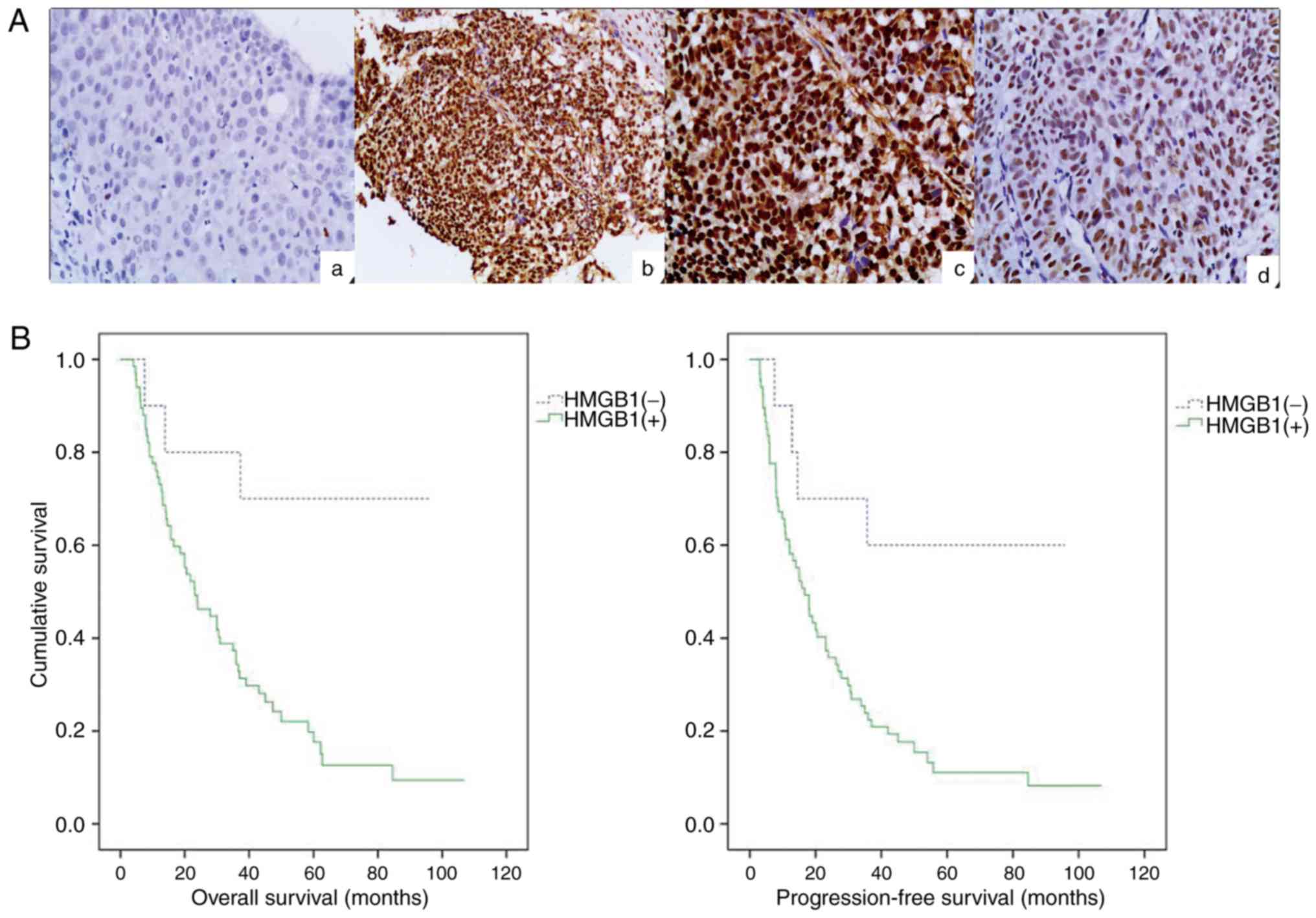 The data collected in the present study were analyzed using SPSS software package version 21 (SPSS, Inc., Chicago, IL, USA) and recorded as the mean ± standard deviation (SD). The endpoint of progression-free survival (PFS) was assessed from the beginning of CRT to progression, death or the date of the last follow-up. The survival analysis was carried out by Kaplan-Meier method with log-rank test and the χ2 or Fisher's exact tests was used to analyze the association between clinical parameters and HMGB1 expression. The comparisons of data between different groups was performed using ANOVA with least significant difference (LSD) test. If the P-value of a two-sided statistic test was <0.05 or <0.01, the result was considered to be statistically significant.