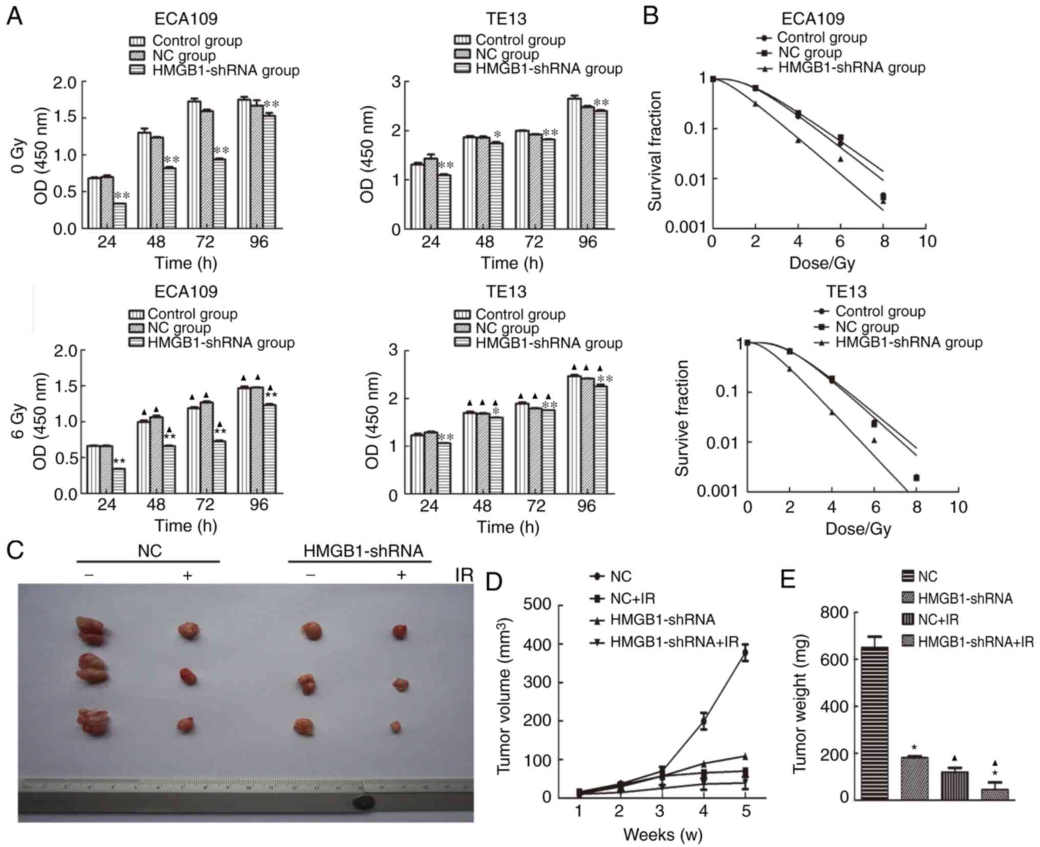 To investigate the biological function of HMGB1 on the cell viability of esophageal cancer cells, cells under different conditions were collected at 24, 48, 72 and 96 h after transfection and irradiation. The results of the CCK-8 assay indicated that the proliferation rates of the HMGB1-shRNA groups were significantly lower at each time-point than those of the corresponding control and NC groups with or without irradiation (Fig. 2A). In addition, a colony formation assay was applied to detect the effect of the alteration of HMGB1 expression on the radiosensitivity of ECA109 and TE13 cells. After the cell survival curves were plotted based on the formed clones, and the radiobiological parameters of each group were input into statistical analysis, it was revealed that the radiosensitivity of the HMGB1-shRNA group was higher compared with those of the control and NC groups (Fig. 2B). To explore the function of HMGB1 in tumor formation in vivo, the HMGB1-shRNA and NC cells of the ECA109 cell line were implanted into nude mice. The results revealed that the tumor volume (Fig. 2C and D) and weight (Fig. 2E) in the HMGB1-shRNA group were notably smaller than those of the NC group before and after irradiation (P<0.05). These findings indicated that transfection with HMGB1-shRNA induced proliferation inhibition with or without irradiation and increased the radiosensitivity of esophageal cancer cells both in vitro and in vivo.